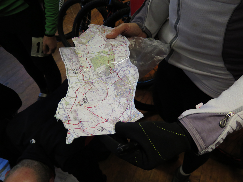 There about twenty of us assembled at The Tri-Store, some faces from last year – Jo, John, Biff, Jim, Kris, Mark – and some new ones – Simon, Tom, Paul, Scott (like me last year, it’s his first off road ride). There are two Davids, one who has come from Devon, and the other from America via Belgium. There are others I don’t know and I don’t see them again all day. They must be the ones that take it seriously. There are cyclocross bikes, mountain bikes (cheats1), and single speeds (idiots2). There’s chatting, smiles and laughter, numbers being pinned on, perusal of maps, inner tubes and emergency gels being purchased. Stamp cards are handed out3 and then someone shouts “GO!” Nothing. “Go on then. GO!!” We all pedal like mad up the street towards the first hill of the day. Nothing like a gentle warm up or pacing yourself.