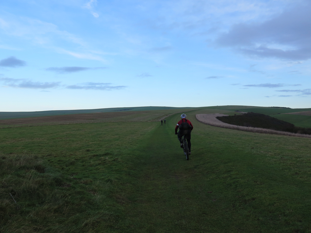 A few hundred yards along the top of the downs and it’s straight back down to Comp Lane again via Bo Peep Bostal. Then another few hundred yards further along Comp Lane we turn straight back up the escarpment. Another steep slippery grass track up to the SDW. Futile remember. After another puncture is repaired it’s straight back down again towards a place marked as Sanctuary on the map. If only. We immediately turn back on ourselves up the flint laden chalk path to Long Burgh and then straight down a gravel track into Alfriston. I’ve noticed that the light is fading, a mix of cloud and lowering sun. Hmmm.