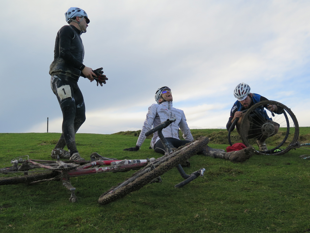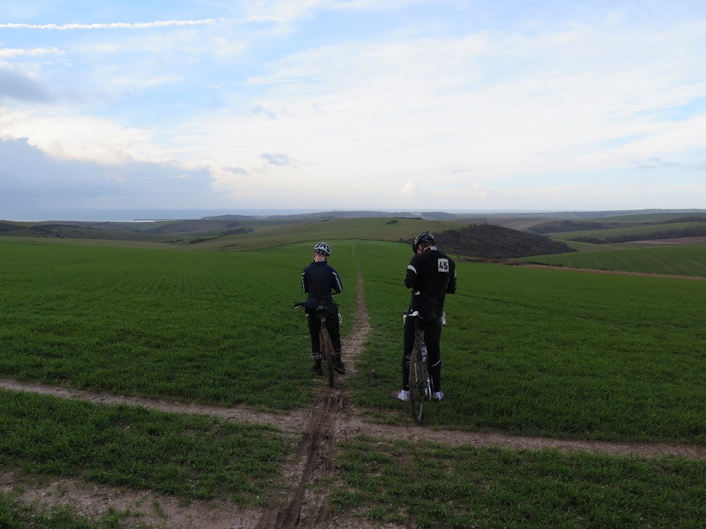 The road out of Alfriston is closed as the village has been submerged under Cuckmere floodwaters for a few days now. Some of us hop up onto the raised path around the flood, others jump straight in including Jim who appears to be up to his knees in water at one point. He doesn’t care, it’s washed all the clay, mud and grass off his bike, and it feels twice as light. Heading back across the Cuckmere River we’re on the final stretch home. Well sort of, as you’ve probably gathered the UCX course doesn’t exactly follow the shortest path between points on the map. Crossing Milton Street we start the long, long slog up and over Windover Hill but (America via Belgium) David punctures a tub. It then turns out that the tub has been slashed by a piece of flint. The last we see of him he is walking over the side of the downs towards Wilmington with his bike over his shoulder. People shout various options of how to get back to Eastbourne. We’re not sure we’ll see him again4.