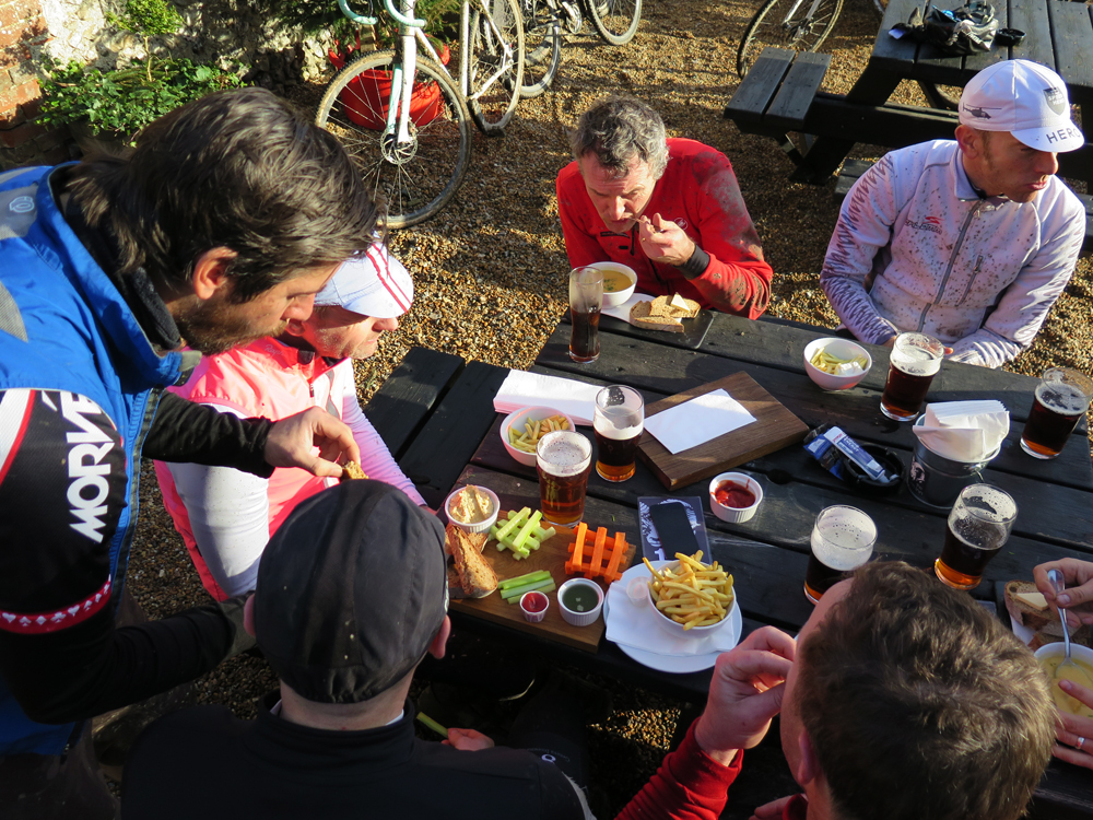 Back at the radio station after grinding up a lane of smashed tarmac, rubble and bricks I rejoin the SDW but east this time to the top of Firle Bostal. Half a mile of freewheeling on smooth tarmac and I arrive at Ram. There are a lot of dirty bikes leaning against walls and dirty riders supping pints and eating chips. All of our little group are here plus Mark and Kris. They must have been here a while as I’ve not seen them since we left Eastbourne.