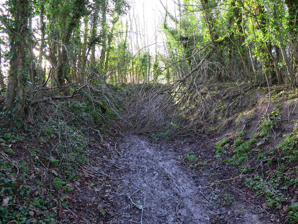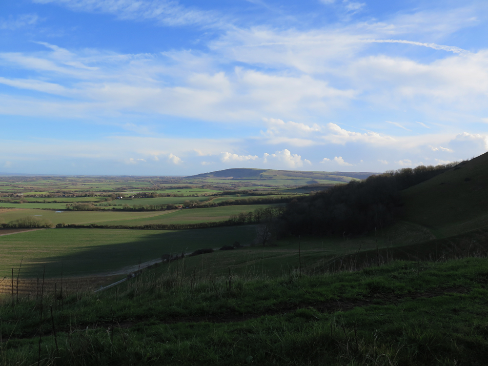 After the most refreshing pint of Harvey’s I’ve had in a long time, probably since the one here last year, it’s along the bottom of the downs on Comp Lane. We scramble through trees and gloopy mud to pick up a ridiculously revolting climb, a steep grass track that cuts across the steep contour of the escarpment back to the SDW. It’s really rather hard walking up wet grass slopes in road cleats. I can see John’s pink gilet glowing near the top. Looking east I see Windover Hill, which is part of our route. Unfortunately I also know that we go up and down the scarp another couple of times before we get there. No wonder FUTILE is half the tagline.