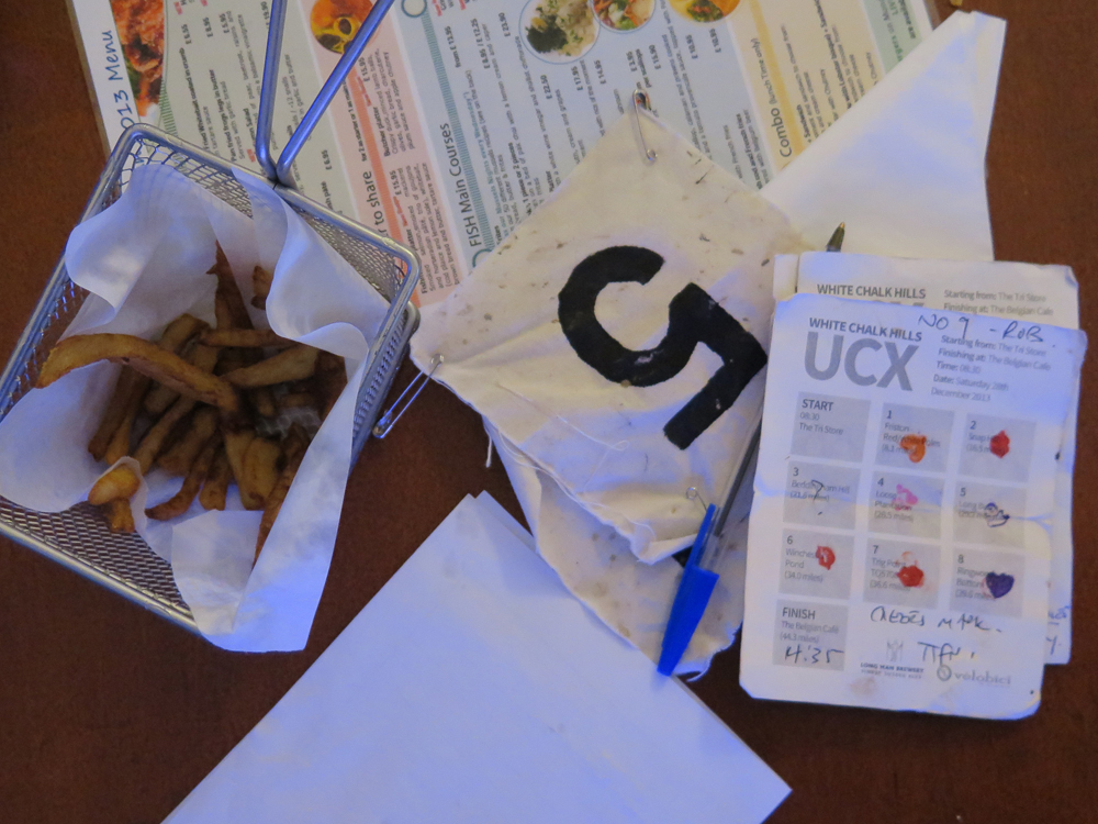 In the warm and dry of The Belgian Cafe riders are drinking strong dark beer, dipping fries in mayonnaise, and regaling each other with stories of epic derring-do and stupidity, whilst Mark hands out prizes for best crash (himself obviously) and most futile ride (David and his slashed tub, he made it back). I love this ride. Don’t get me wrong it is as hard as hell, and worse than that when it rains. However it’s ridden by a great bunch of people in exceptional good humour – gang mentality sets in, that perfect mix of support and laughing at each other. This more than makes up for everything the weather and South Downs can throw at you in December. At least I didn’t fall off this year.