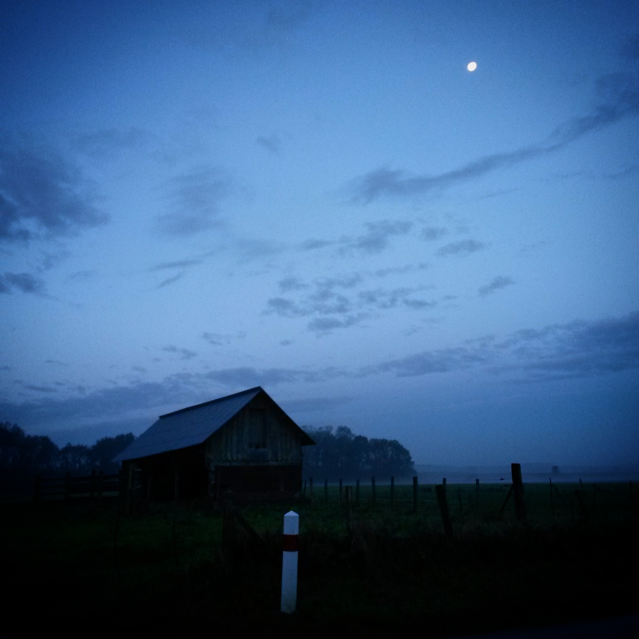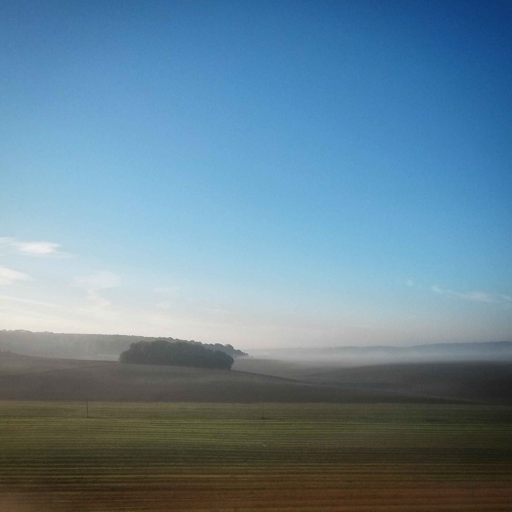 In fact the crossing isn’t too bad, if anything the gentle rolling of the ferry aids sleep. It’s only a four hour crossing and we’ll dock at 4am French time so the aim is to get as much sleep as possible. However, fitfull sleep is all I manage and long before dawn and still half asleep I roll down the ramp into France and drizzle. Nigel boots up the Garmin (I’m still reliant on paper maps and scribbled route notes) and we head for a cash machine whilst it locates some satellites. We head off through the empty town east via industrial estates until we reach unlit roads out into the hills. The sky continues to leak and clouds are animated by a bright moon. It’s promising that we can see the moon, it means the cloud is broken and not thick. There’s enough moonlight to make sense of the landscape around us, open farmland interspersed by wooded hills, but we can only really see what is illuminated by our lights, damp roads and fallen leaves. Red beacons flash atop wind turbines on the ridges towards the coast. After a couple of hours there’s a long fast descent into the Bresle valley before we immediately turn back up the valley side twisting through forest towards a lightening sky. Dawn must be on it’s way, cockerels are calling the sun as we pass through villages. As light seeps into the sky the rain fades away, moonlit clouds gradually give way to a washed out pale blue sky, growing more vibrant by the minute.