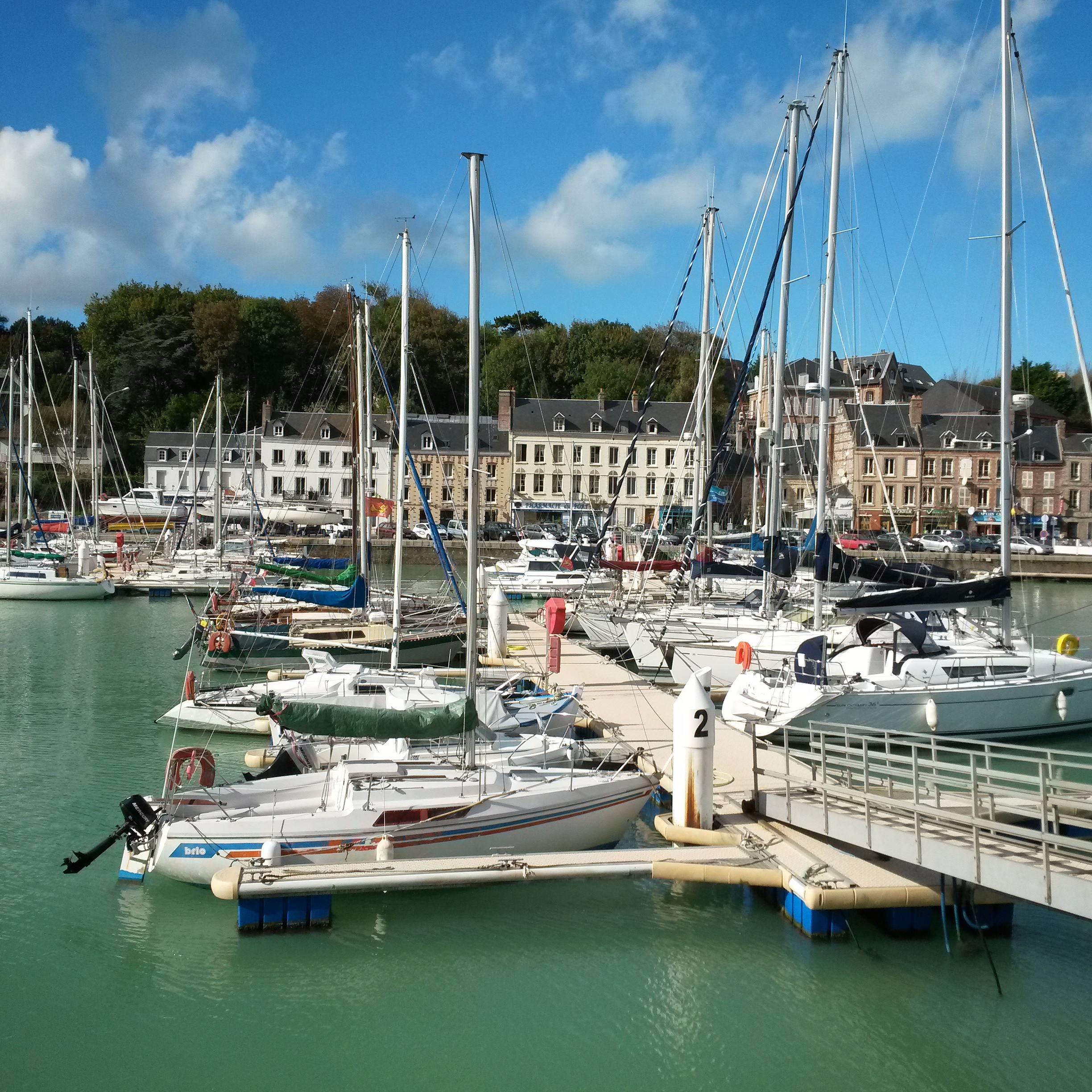 This side of Dieppe is a landscape of agriculture, reminiscent of the east of England. It’s lumpier than our eastern counties but not as hilly as the country we rode the eastern side of Dieppe. The path of roads are visible far ahead running along the borders of fields, occasionally dipping from sight. Dark, ploughed fields ripple away from the roads edge. Every now and again a golden field of corn drys for animal feed or a verdant carpet of fresh beet reaches towards the horizon. Dogs bark at us from behind fences and hedges at every village. Before we turn north for the coast we stop at a bar for a drink and to replenish fading water supplies. Following narrow winding lanes we soon hit the coast where the water is a shade of blue rarely seen our side of the channel. Looking across the marina at Saint-Valery-en-Caux it could be July rather than mid-October.