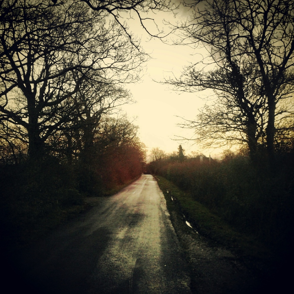 To the south lies Wiston House (1576) to the north Peppers (1611) and the lane runs through parts of Wiston and Pepper’s estates. Riding east to west you first pass Calcot Wood on the left, open fields to the right, before being plunged into darkness in Great and Little Pepper Woods. The branches of trees from each wood interlocking over the lane. As with many lanes that wend their way through woodland the seasonal differences are pronounced. Under the thick verdant canopy it’s usually darker here at midday on a sunny summer’s day than twilight on a gloomy winter’s day. In winter zebra stripes of light below your wheels mirror the interwoven branches above your head. In summer bright pinpricks pierce the foliage dotting the road with spots of light tracking the sun as it moves across the sky hidden above, beams tracing across tarmac like slow moving searchlights. Looking up is like looking up at the stars in the night sky. In the autumnal setting sun colours are muted, desaturated in the fading light, but vibrant wedges of golden light cut through the trees like torch beams.