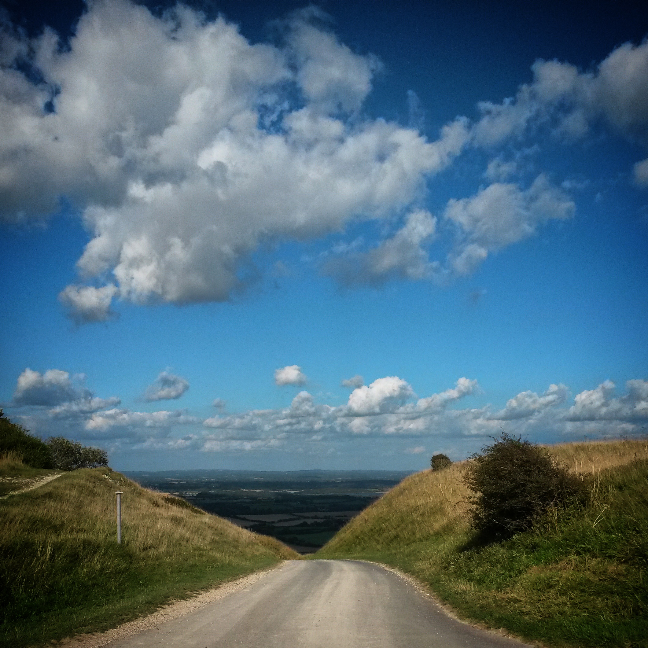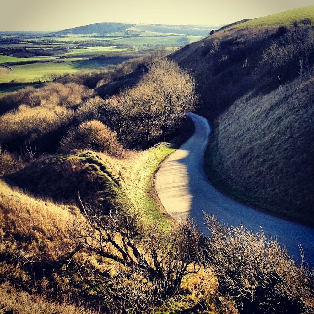 Crossing the A27 you head off past a ‘no through road’ sign along a lane that gently ripples like a wave lapping at the foot of South Downs. There’s a tell tale ‘v’ shaped nick in the top line of the downs but the climb itself is hidden from view. You can see the contrasting whiteness of the chalk pit below the green summit. Bo Peep Lane gives way to Bo Peep Bostal as you cross the path of Comp Lane as it skirts the shallow scoop of Pearson’s Wish. You enter a funnel of trees, as if burrowing into the chalk hillside, except you can feel the land rising. On those clear winter days when the sky is a washed out blue the sun will disappear from view and you won’t see it again until the top. You’ve plunged into the shadow of the downs. Nearer the middle of the year dappled light dances on the tarmac.