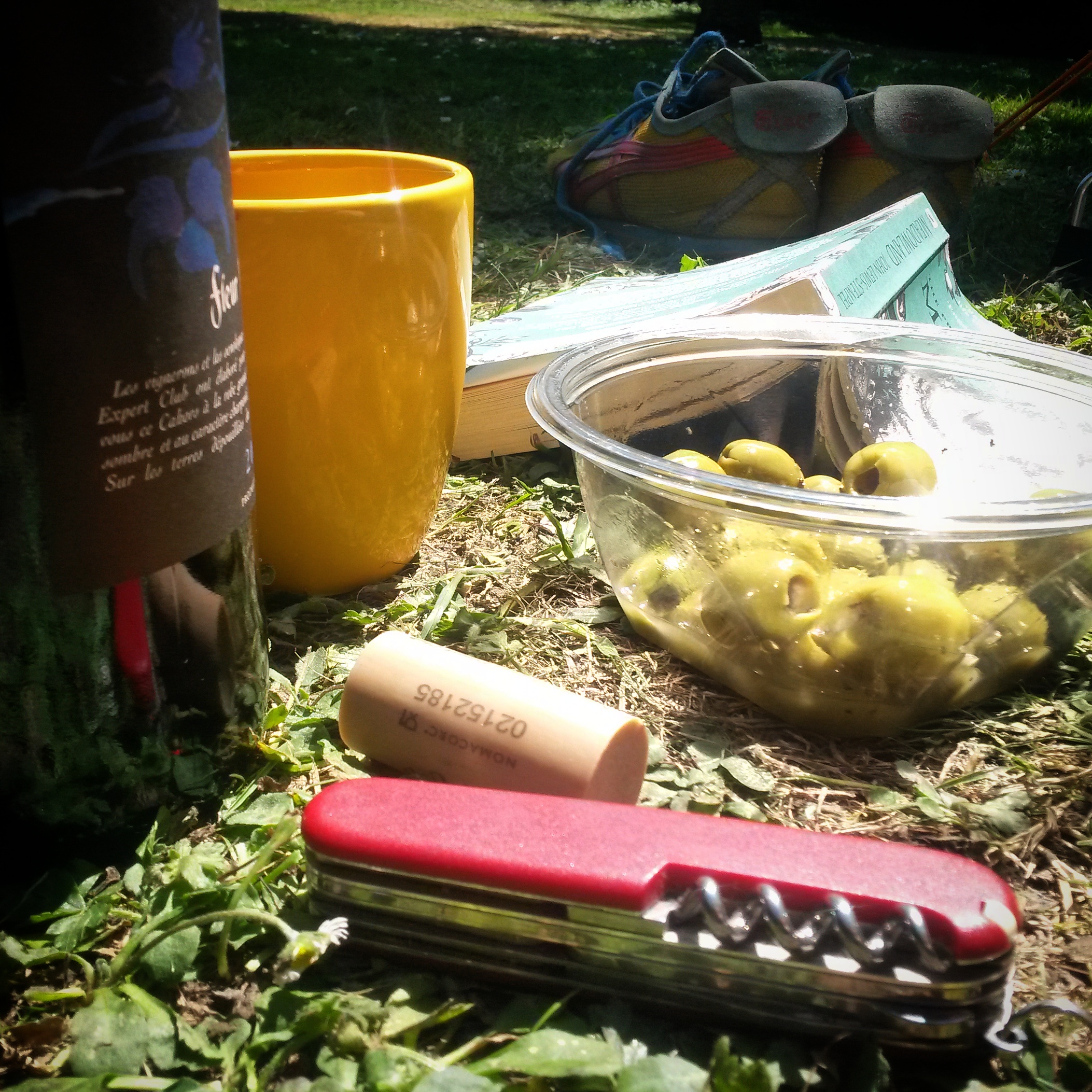 Rest day. A book, a bottle of wine, sitting under a tree.