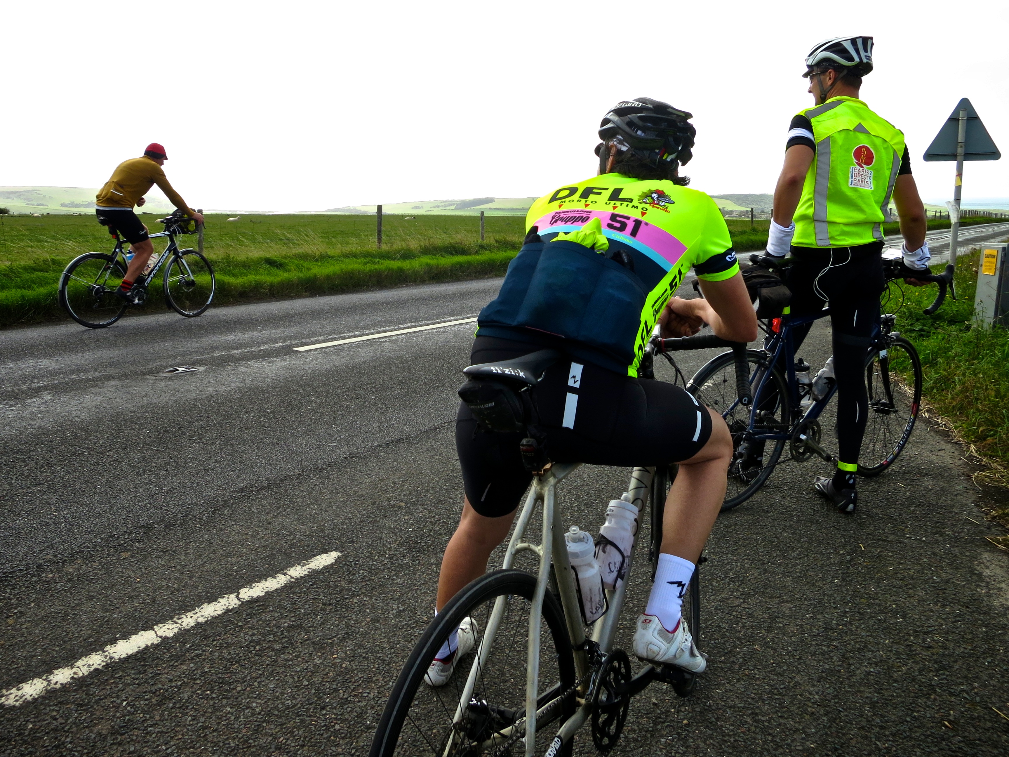 A can of coke is emptied into a bidon and a bag of jelly babies is torn open. The route sheet is turned to the next page and the sandwich bag re-taped to the stem. It’s time to head back to the seaside. The next part of the route is in that part of Sussex that is a bit too far from home to be regular riding country. Every now and again I have a “Oh, we’re here” moment as I recognise a lane from some of the early season audaxes I did. Eventually we pop out on a main road near Battle and I have my bearings again. A signpost says 6 miles to Bexhill, the second coastal control. A lot of unexpected climbs are squeezed into those 6 miles. When we finally see the sea sparkling ahead of us there is a collective sigh of relief.