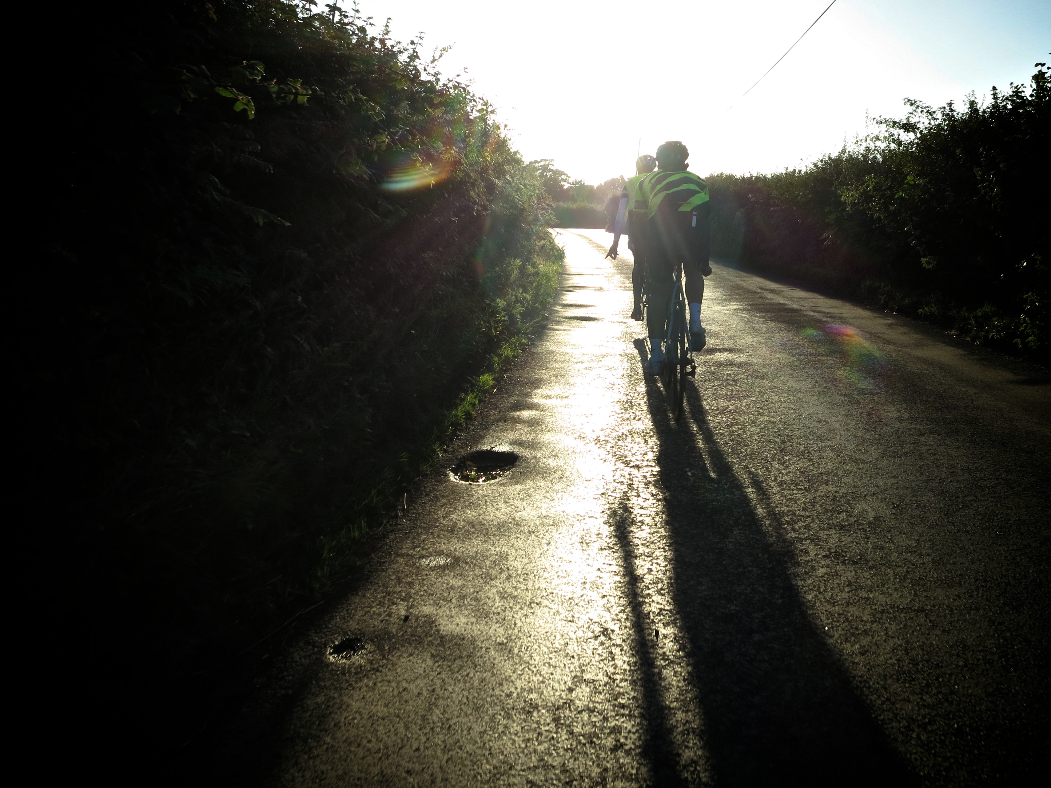 Our shadows are long as we roll out of Bexhill. We’re on the final stint now. Admittedly it’s 100km back to London but psychologically this is the finishing straight. We chase the sun up the slope back onto the High Weald (again) before the rollercoaster of hills starts (again) as the sun finally drops over the horizon. The view back across the twilit weald is stunning, muted green and blue hills rippling away towards the coast. We flick on our lights as darkness seeps into the sky.