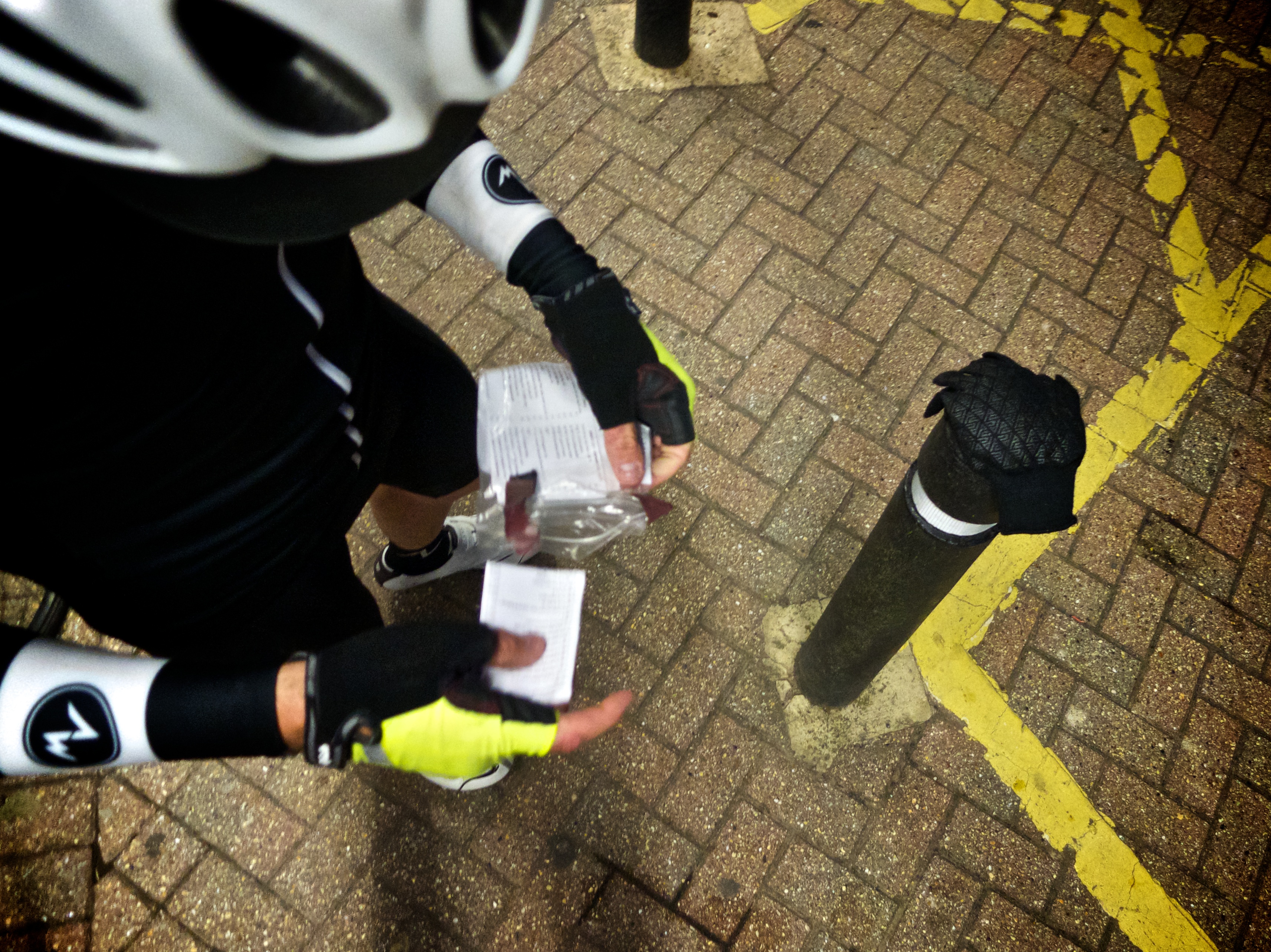 Ivan from Audax Club Hackney hands us our brevet cards from the boot of a car near the Cutty Sark. Tea and coffee are available on a trestle table set up around the corner in an underground car park where a bunch of hi-viz clad riders are gathered listening to the rider briefing. We forego warm caffeine and follow blinking rear lights along the long straight Roman road towards Kent.