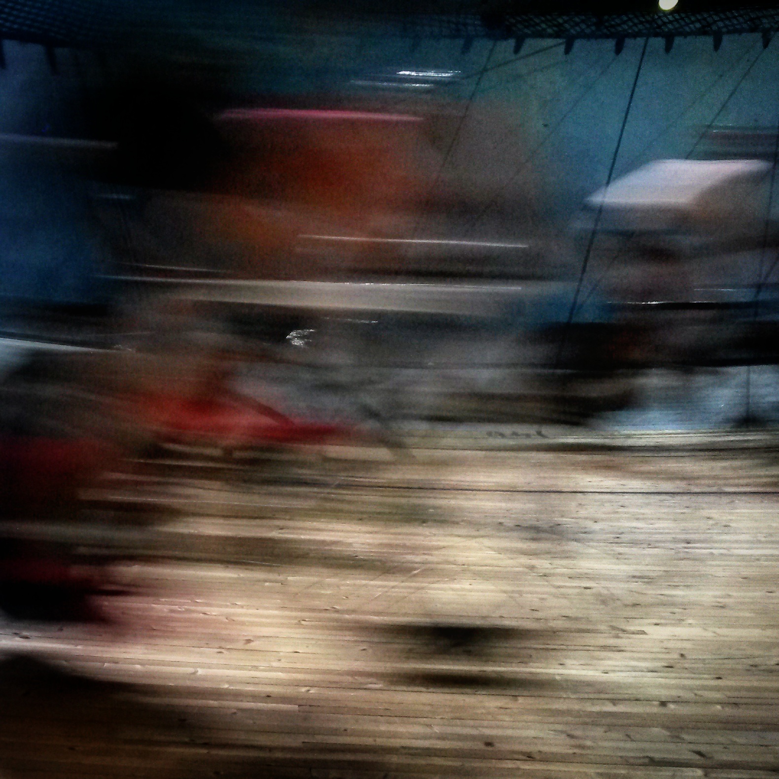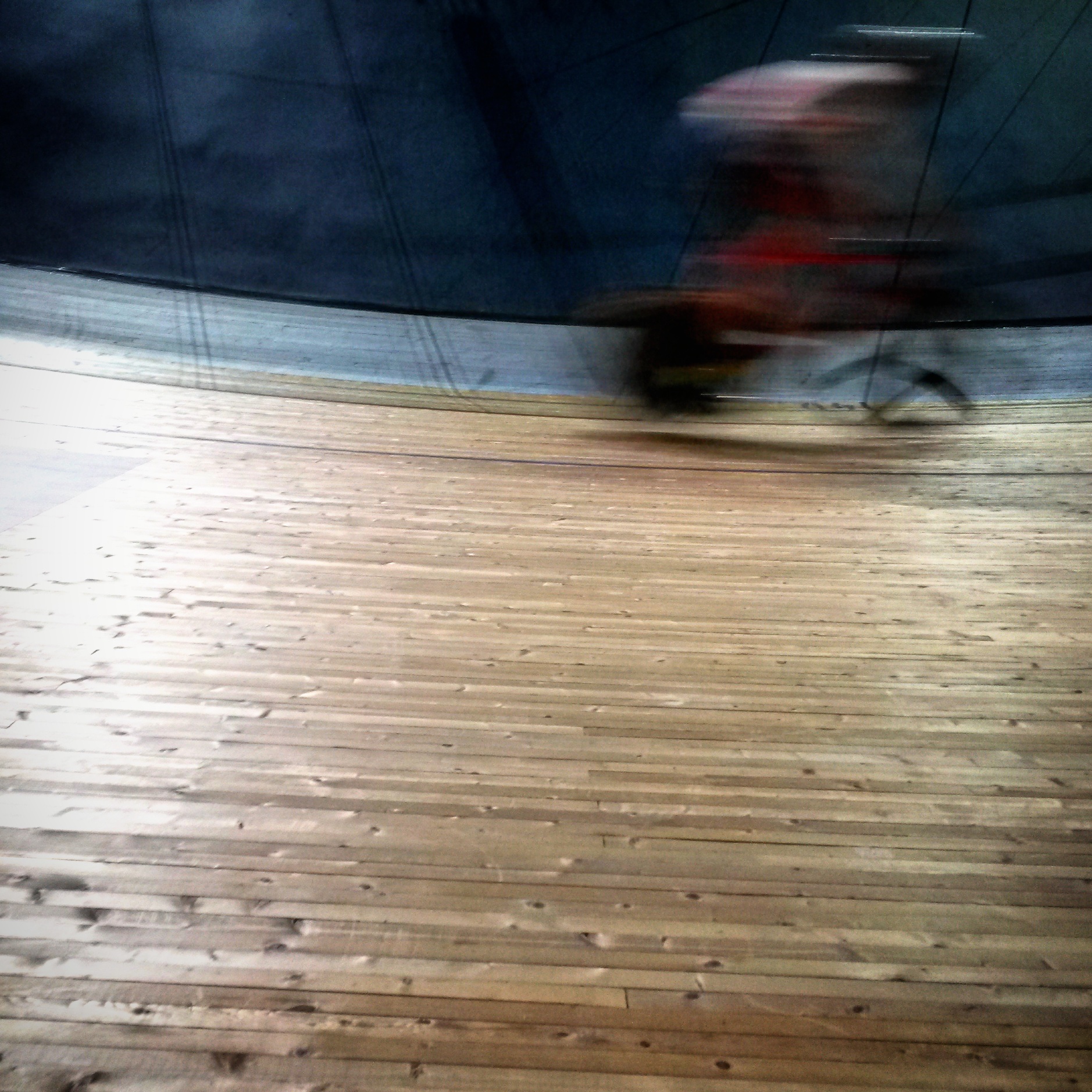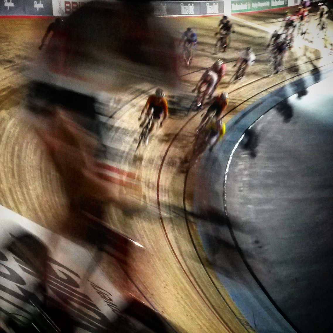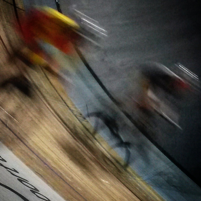 The final chase. The last race of the night. A madison, an undetermined number of laps. The fug of the previous 40 laps of the dernies hangs in the artificially warmed air, suspended in the noise and the lights. The audible whirrs and whizzes of big, big gears, the rumble of high pressure tubs on wooden boards. Leaning over the barrier the hum of the laps vibrates through me. Tight on the inside line at the bottom of the track riders chase each other at ever increasing speed, flashing colours blurring together. Team mates float high up on the banking, at a seemingly impossible angle, close enough to hear their breathing, waiting, recovering, before dropping back down, to be flung into the action again…