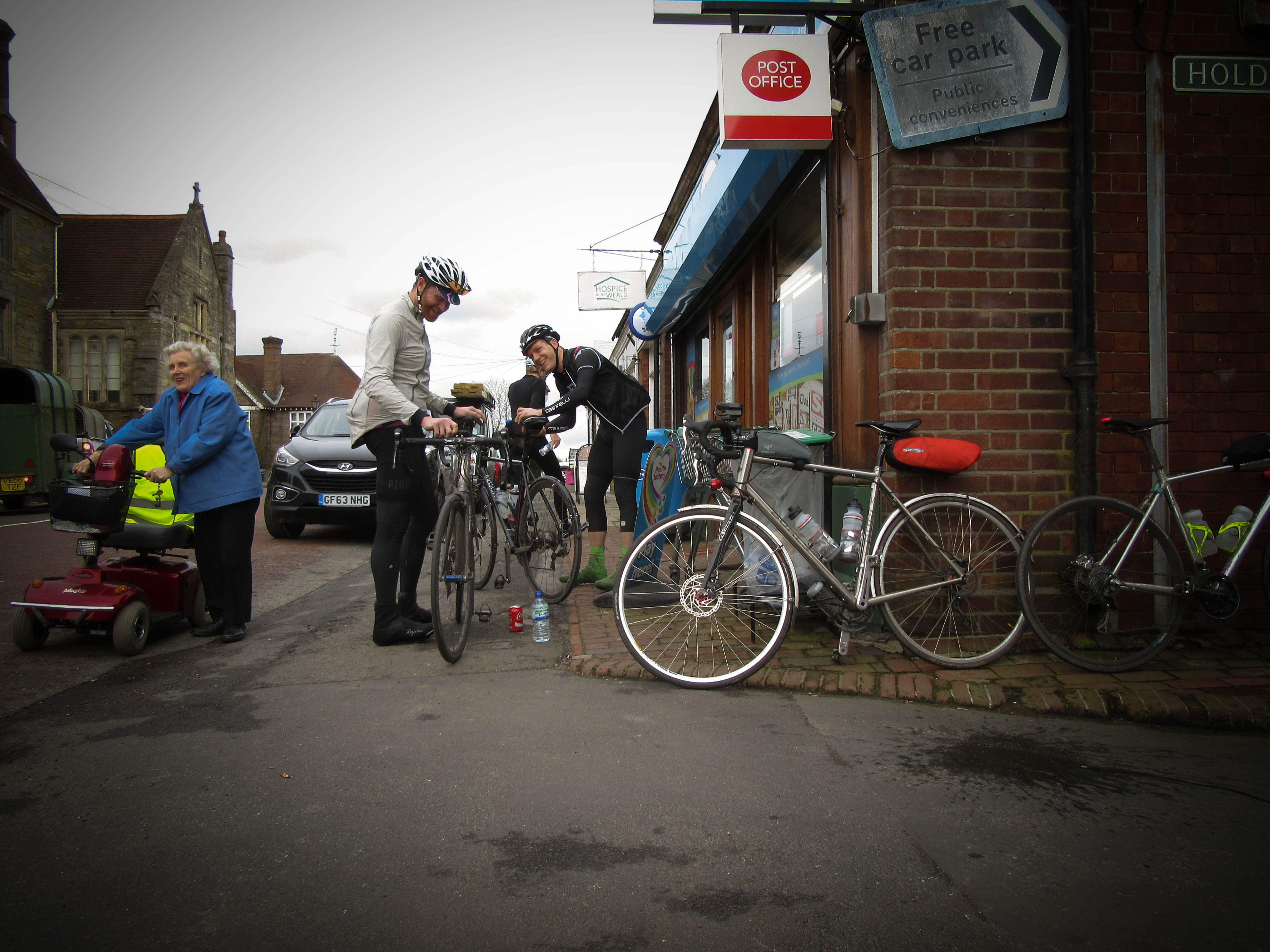 We set of from Chiddingly in a small peleton – me, George, Andy plus a group of his friends – across the flatlands around Ripe to Alfriston before it splintered on the steep side of High and Over and down into Seaford for the next info control. Regrouped on the seafront, we turn around and retrace our wheel tracks almost all the way back to Chiddingly in the bunch at a fair old whack. Here the return route veers off for the long climb through Horam and Heathfield, where the group stretch out again, before the inevitable rollercoaster lanes into Mayfield for the next control. This time it’s an open control (i.e., it’s up to us what we do but we need a receipt or something with the time and location on it to prove we were here) and there’s a queue in the tea rooms most people have stopped at. I know there’s another cafe up the street as it’s used on the Hills & Mills audax, but unfortunately it’s shut, so we opt for snacks from the local shop and sit on the pavement chatting with one of the ACH riders.