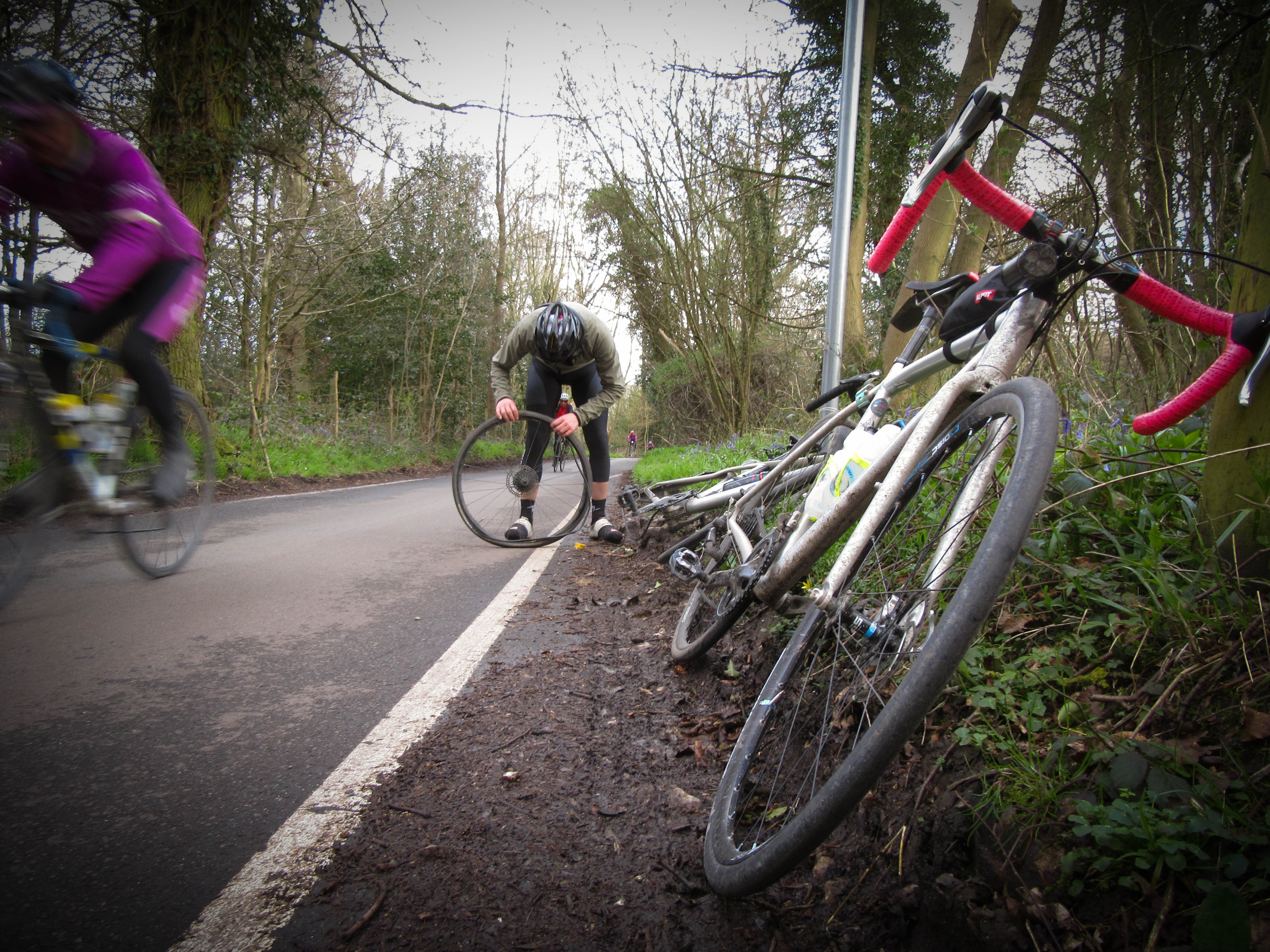 What wasn’t so nice was that ever since leaving Greenwich it had rained harder and harder, we were wet and cold to our bones. Whizzing down the hill after the Ide Hill control we pass our friend Andy, who has stopped with a group of riders in a pub carpark, I shout hello and in return I hear “This is f*cking horrible” through the wind and rain. I’ve lost the feeling in my fingers and toes (I really should buy some proper gloves and overshoes) which made it particularly unpleasant when I have to stop for a puncture near Beech Bough reservoir, as Andy overtakes us again. At this point I was starting to think this might be my third Grimpeurs fail of the year, I am starting to look for reasons to pack. However I get the thing fixed and crack on as the rain slowly starts to ease.