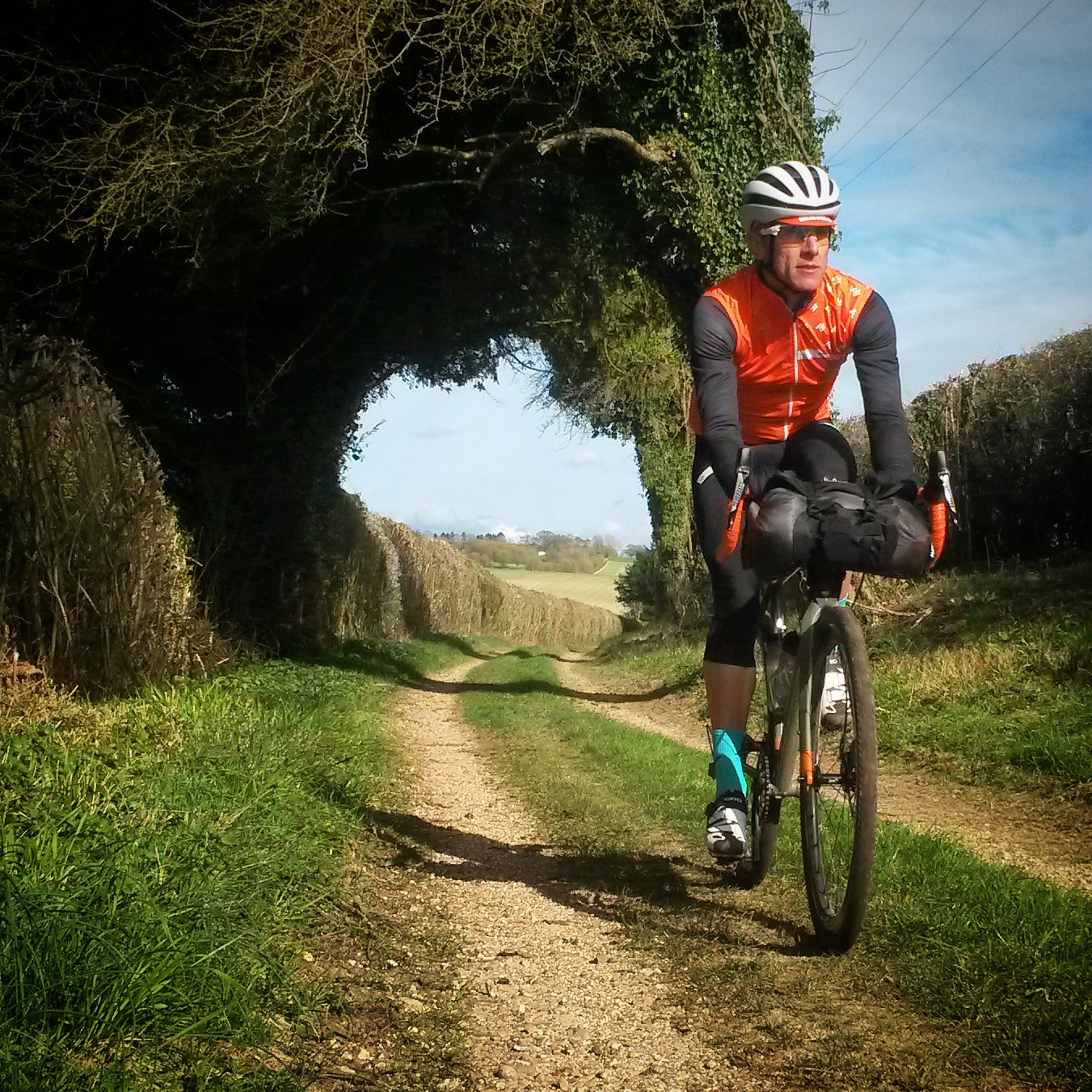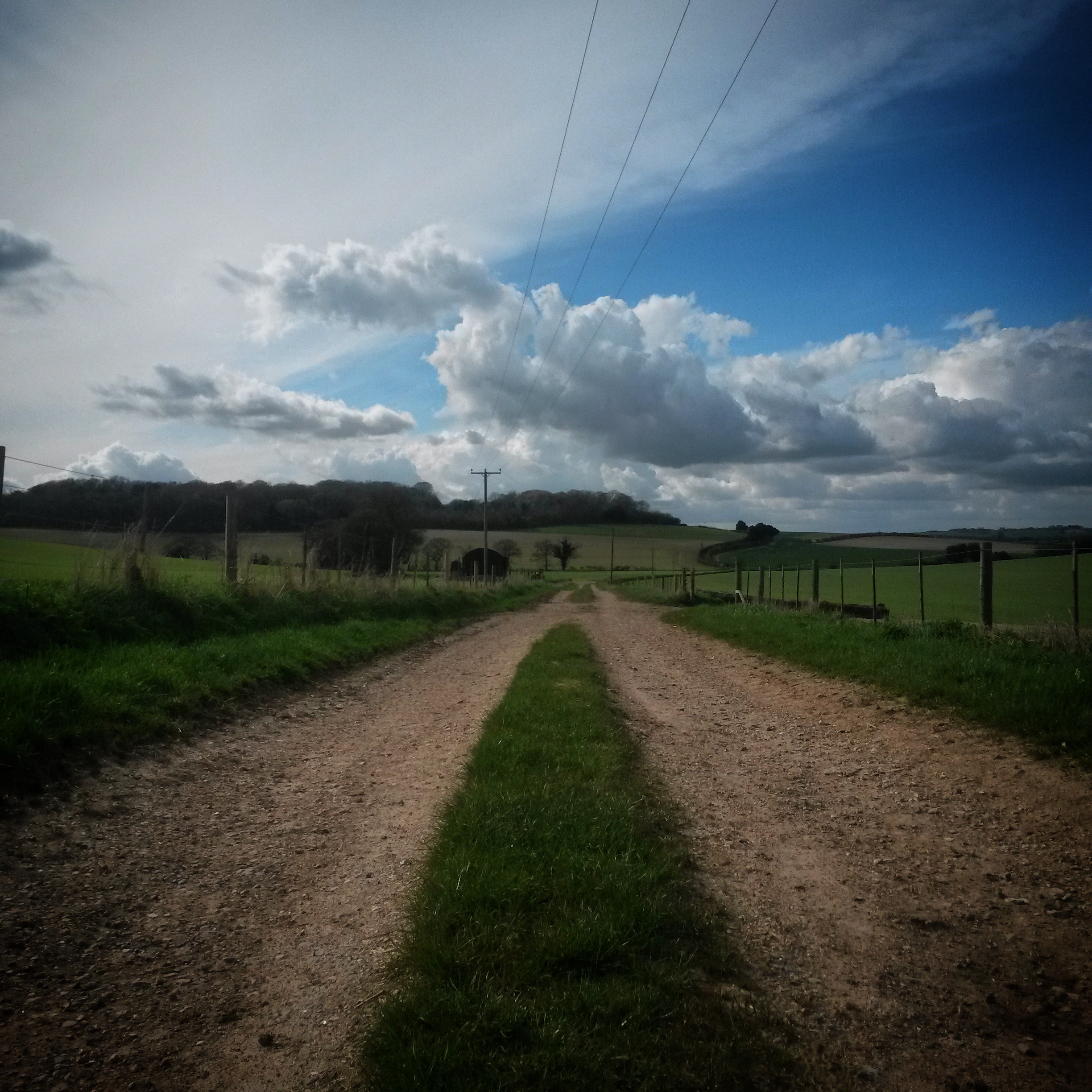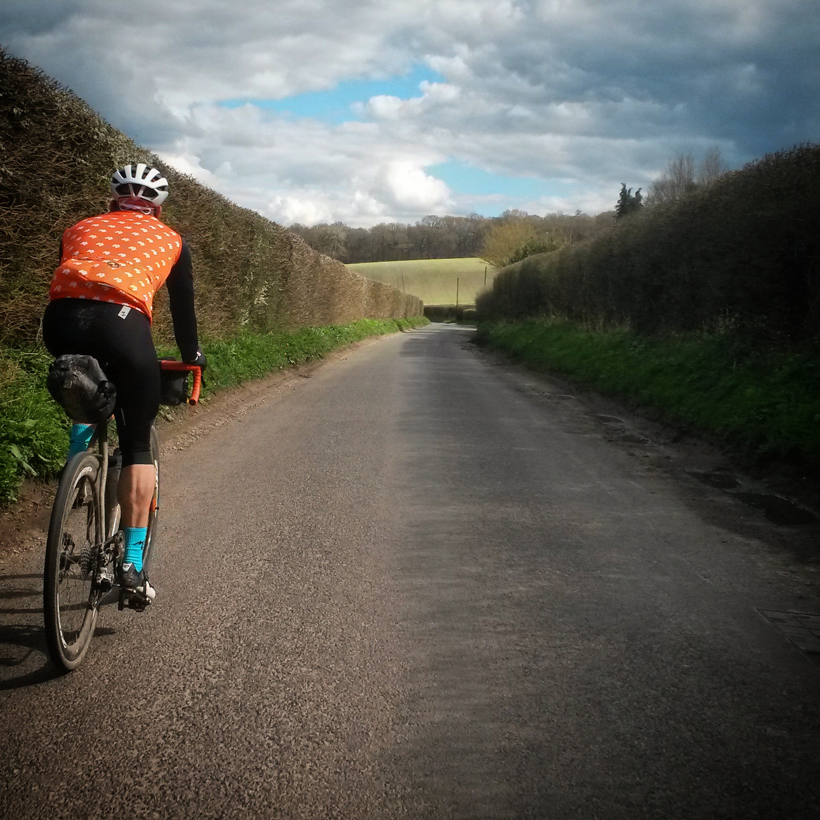 Big ride day. Friends of Jo live “just the other side of Salisbury” which sounded feasible in a day, around 100 miles. Actually, they live near Warminster which is a bit further than “just” the other side. When the shortest line was plotted between Brighton and there the first day’s riding worked out at around 115 miles. The line drawn was roughly through Petworth, Petersfield, Winchester, and Salisbury but without actually going through any of those places. I think that Jo was secretly happy that the fixie frame was still at the sprayers as it meant he could ride the bike with gears. The route wasn’t too hilly, gently undulating across West Sussex, Hampshire, and Wiltshire. Navigation for the first half of the ride was relatively simple – keep the South Downs and the sun on our left. We missed a couple of turns so wiggled about more than we needed, but the sun was shining and we made decent progress. After a short alpine like climb out of Petersfield we dropped onto the A272 for a few timetrial-esque miles and stopped for a pub lunch. After lunch we managed to go the wrong way, or I managed to send us the wrong way, which I should have realised when we ended up in the middle of a town I knew we didn’t go through, but then shortly after noticed my shadow was on the left of me – “Hang on, we’re heading in the wrong direction”. Once back on route we managed to find some bridleways, after turning off a main road that was no fun. A quick glance at the gps app on my phone and it looked like there was a network of lanes that would get us to where we wanted to be.