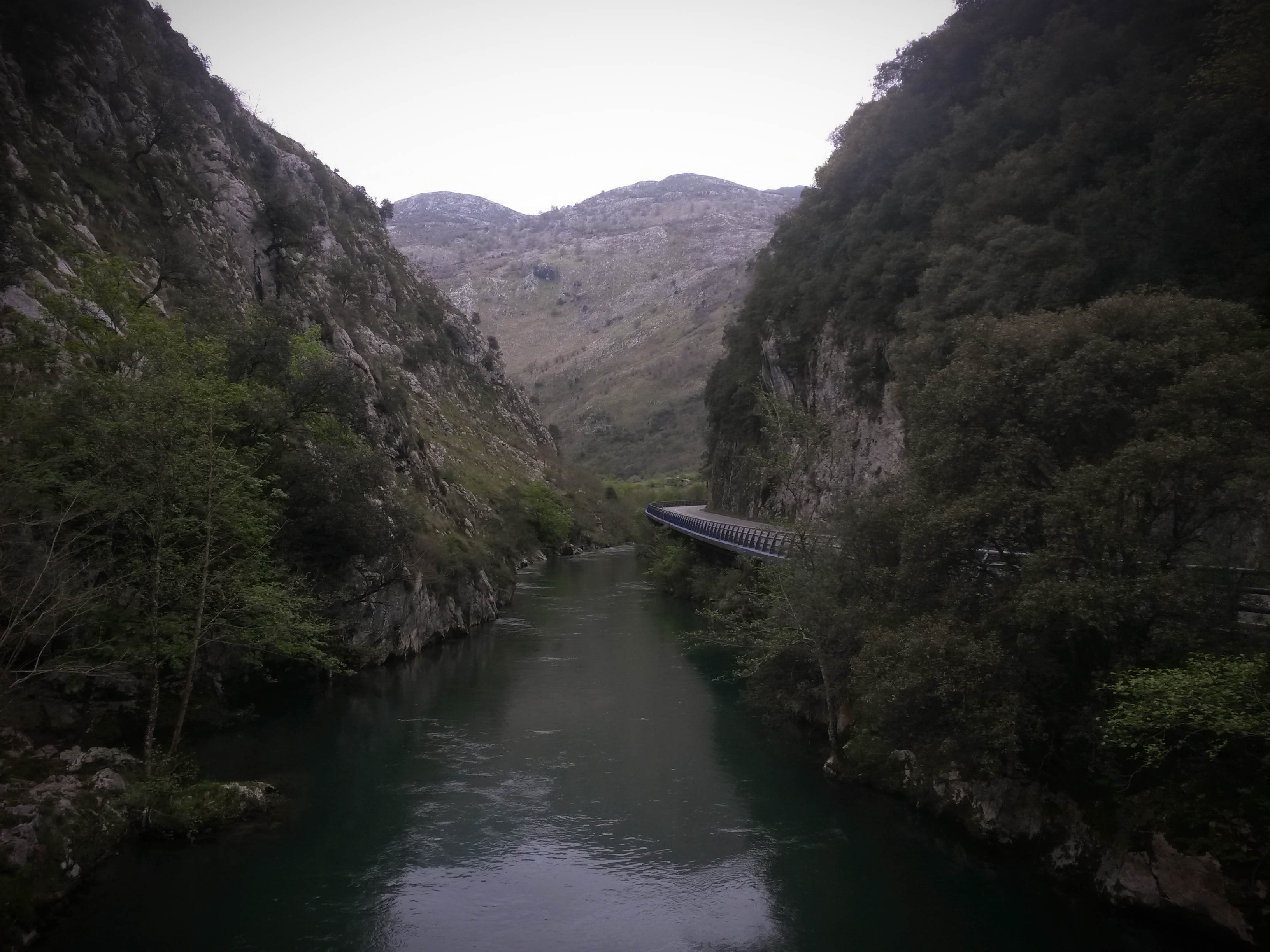 Turning onto the valley road we see that we have 50km to Panes, and then maybe another 30km to Potes. Initially we follow the Ríu Güeña before drifted away from this valley over a long steady climb. At the top we stop briefly to look down into the next valley watching the road disappear through a tunnel and around the edge of the gorge. The descent into the Ríu Casañu valley is incredibly fast, and within a few kilometres we pass where the Casañu runs into the Rio Cares and we find ourselves riding a stunning road squeezed between a rock face and the river.
