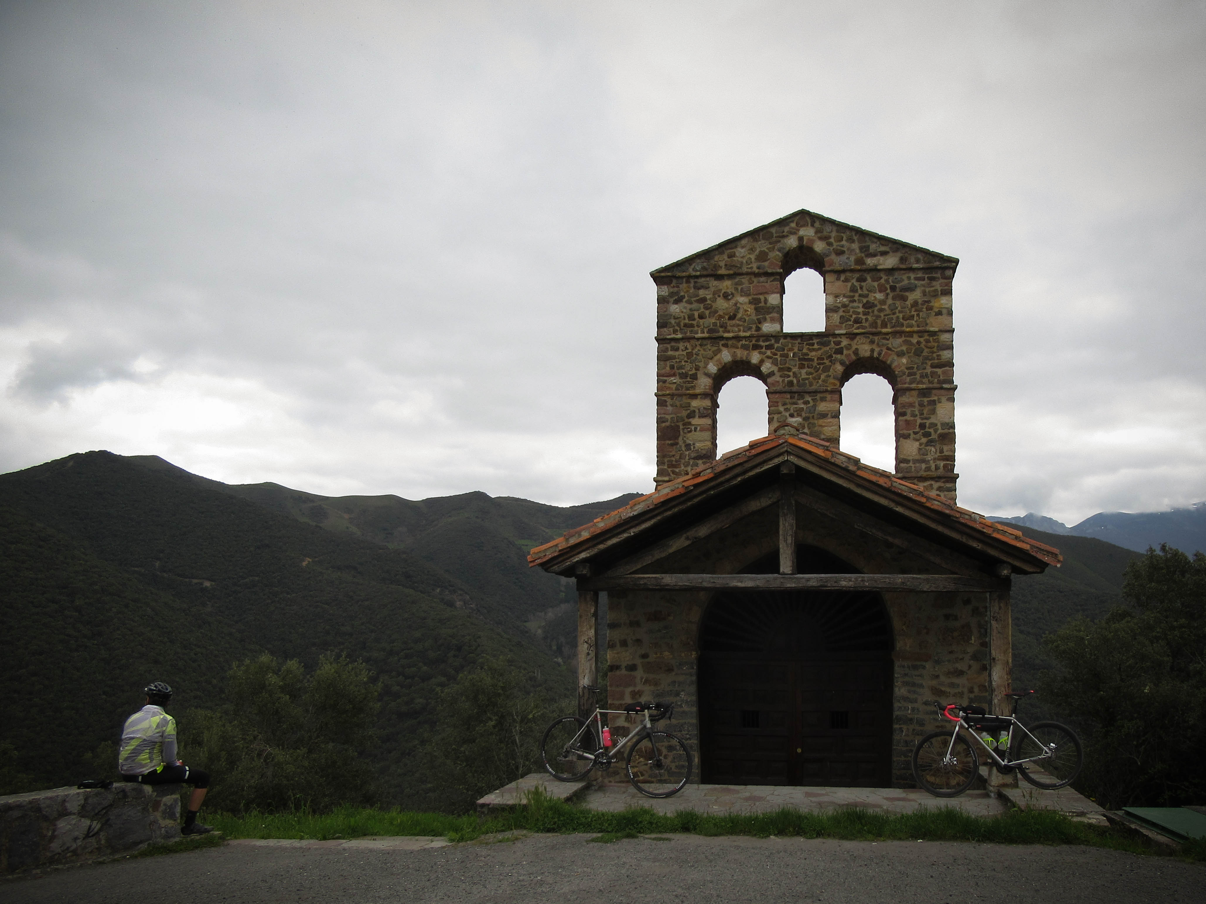 So whilst George gets up early and heads out for the 45km round trip to Fuente De, I have a lie in and then stroll to the supermarket to buy breakfast. Over breakfast I peruse the map and notice there is a small road into the hills just outside Potes, which leads to a viewing point. I decide to pootle out to this to warm up the legs, aiming to be back at the apartment for when George expects to be back from his excursion up the mountain. Just as I’m leaving George appears back from his early climb and decides to join me on the short climb to a small chapel just past the monastery of Santo Toribio de Liébana.