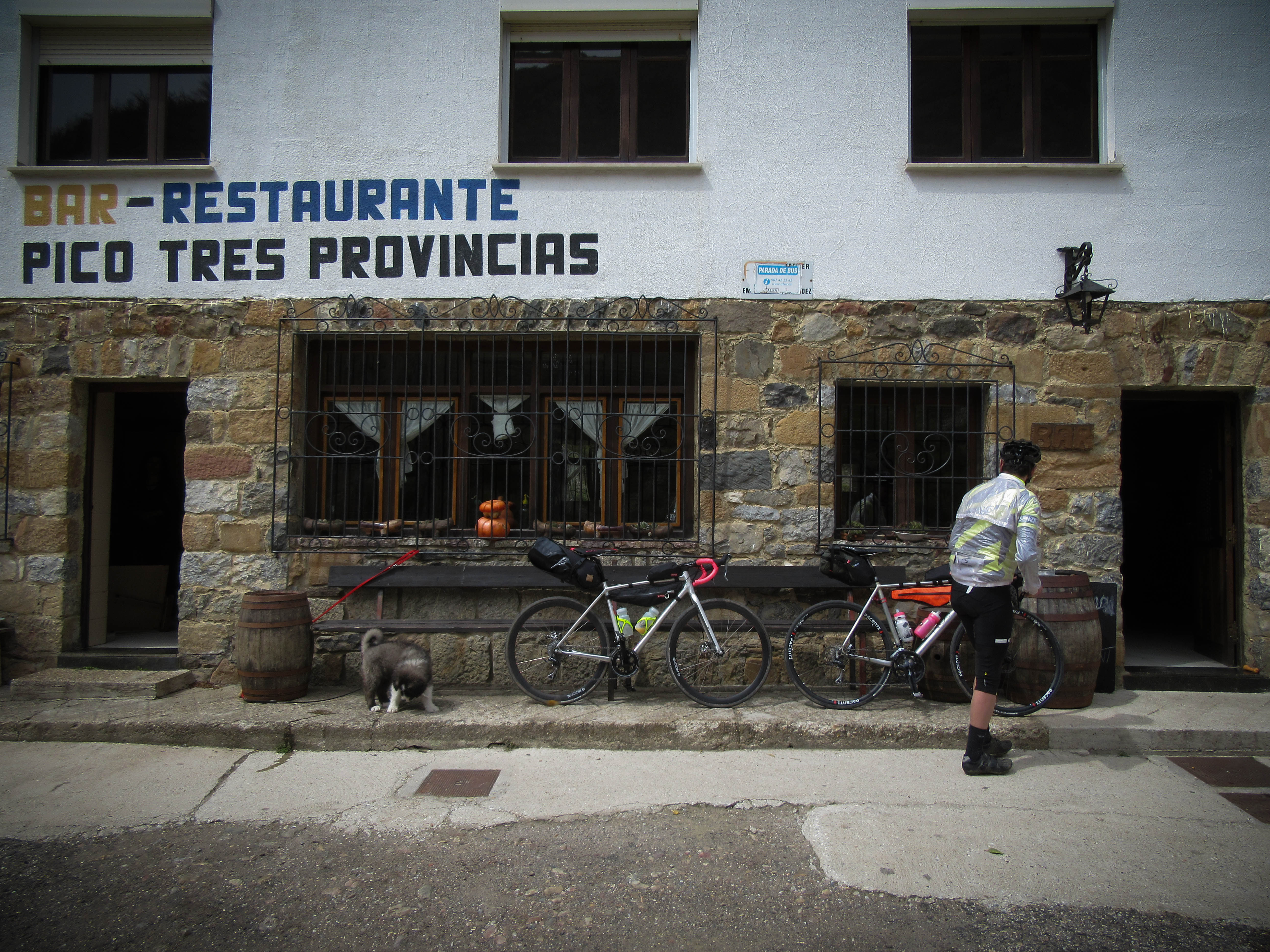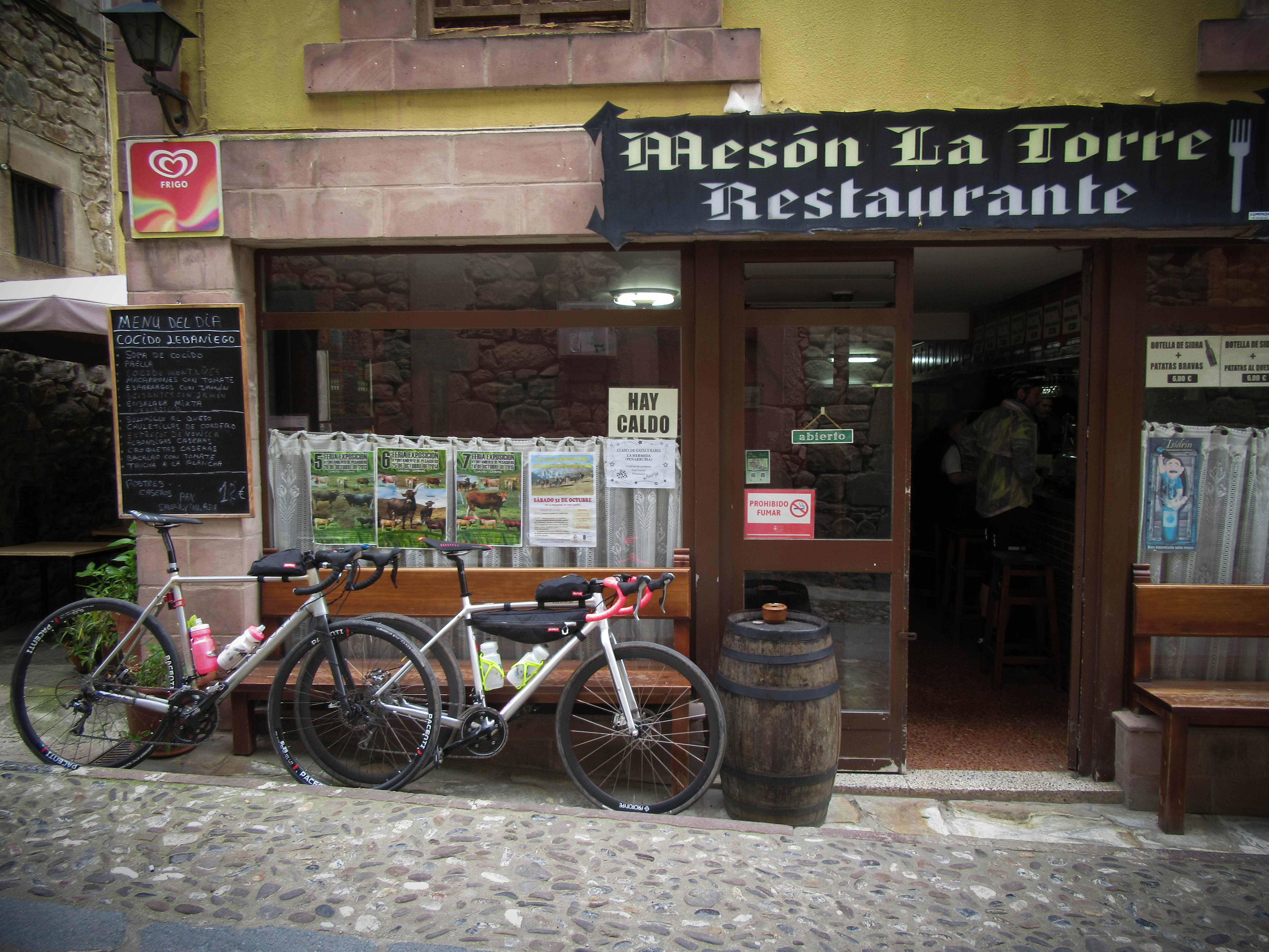 On our way back through town we snatch a quick caffeine break in a small bar before heading to the apartment to get sorted for the ride to Riaño. As we check out I read the detailed contour map on the office wall. The owner asks where we are heading, George says “Riaño”, he replies “I hope you’ve been training, you have to get over the San Glorio pass!” with a knowing laugh. Just at this moment I notice the number on the isopleth next to the road – 1600 metres! We’re currently at around 250 metres. Oh. So much for an easier day. On the plus side it’s only 56km to Riaño.