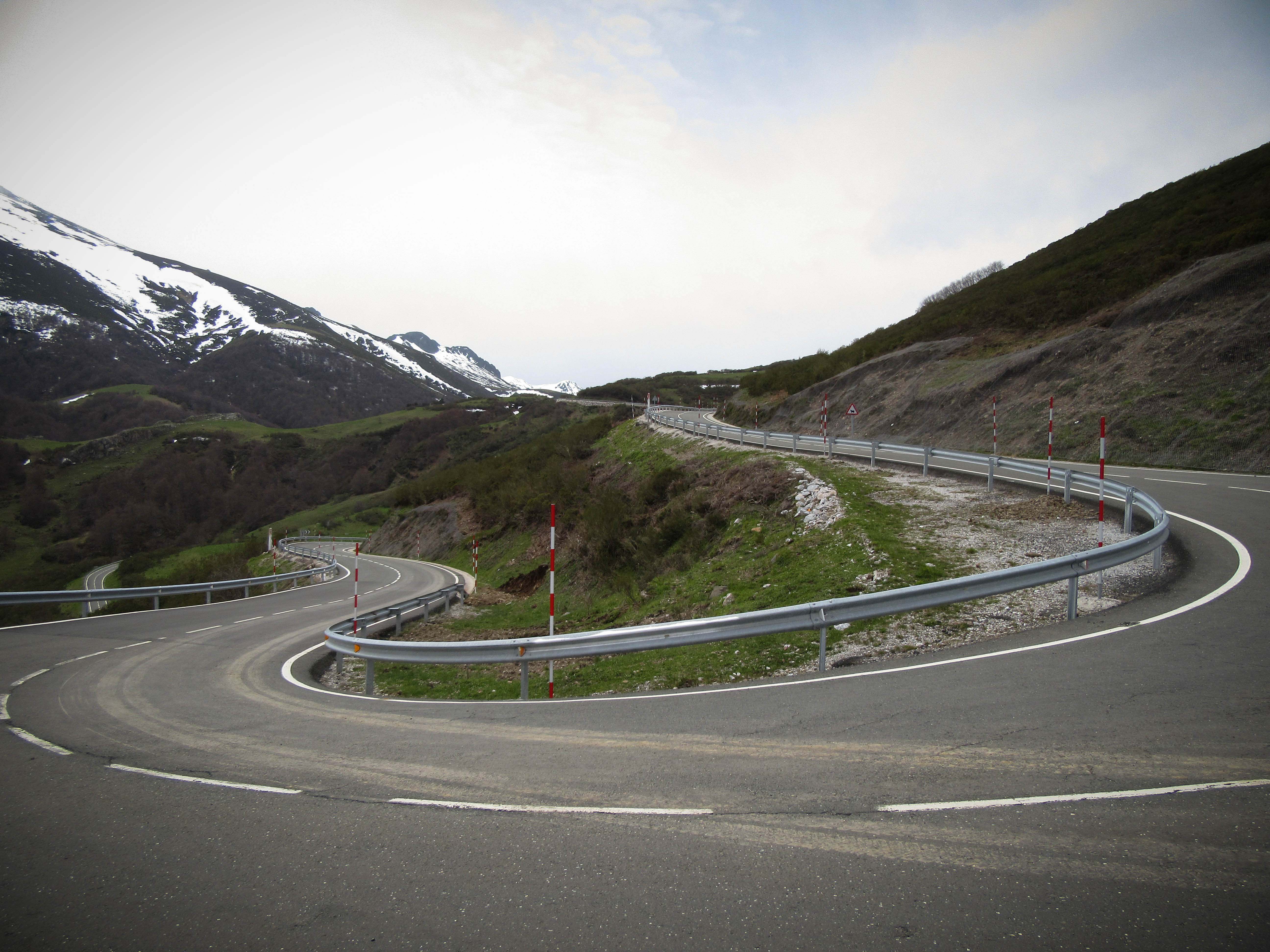 A few kilometres from Potes we pass through the town of La Vega where the Arroyo de Prado Rio and Rio Quinnesa merge, and the road starts to rise as we spot a sign that says ‘Pto. de San Glorio 18km’. The next 18 kilometres is the most stunning road we’ve ridden so far (and the climb to Covadonga, and two gorges, yesterday were pretty spectacular). The bottom section of the climb is gradual rise away from the river bank through meadows, before a couple of hairpins lift us high away from the river. The gradient stays pretty steady for the next 16 kilometres as we climb through wooded corners and switchbacks above the tree line and towards the snow. We know we’re nearing the top as red and white snow poles stand like sentries every few metres along the road side. Every time we look up we can see barriers higher on the mountain side but can’t quite figure where the pass will be in the landscape ahead. We climb higher and higher as the road turns back and forth.
