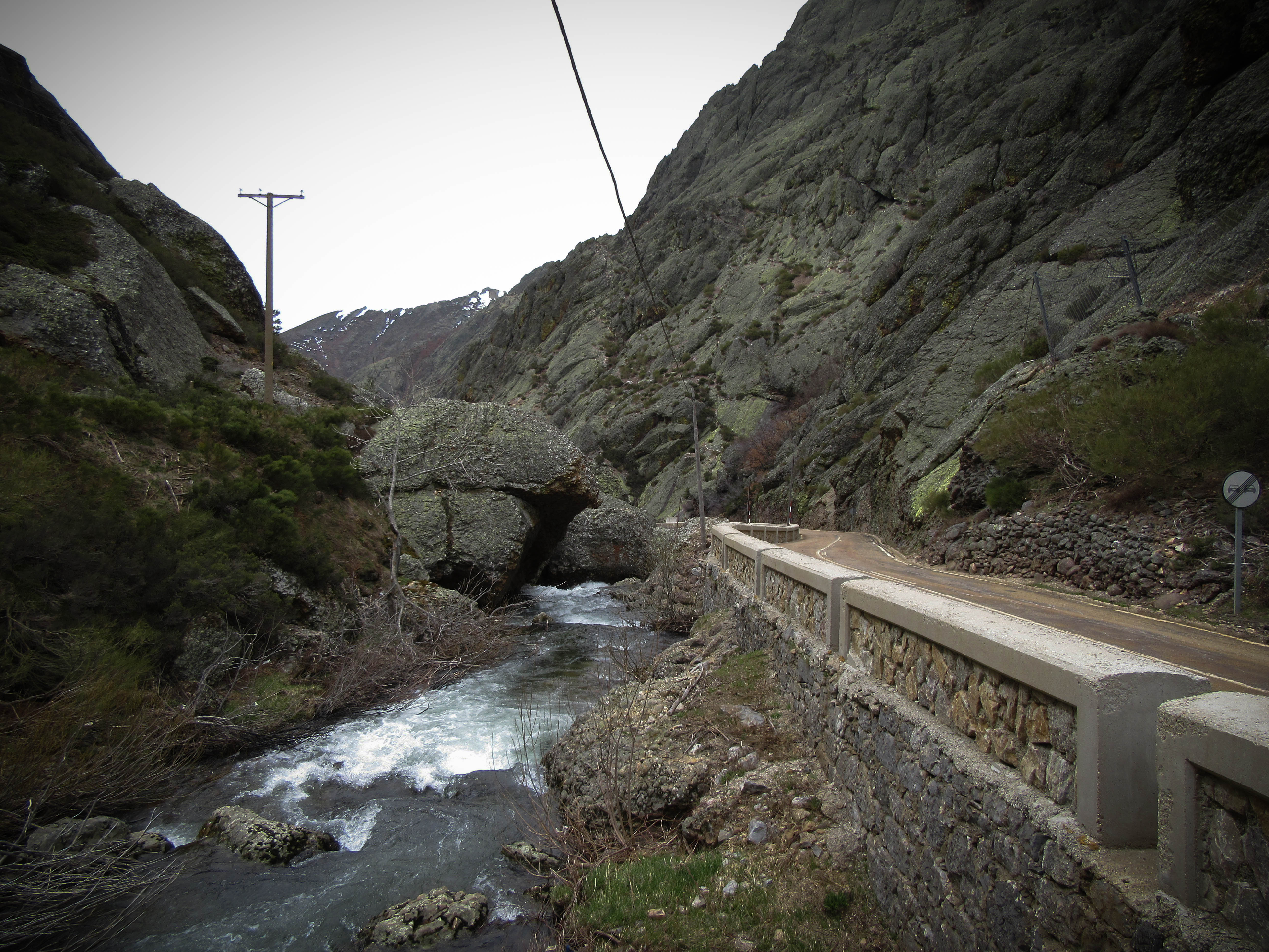 Finally the road straightens and the pass is visible ahead, the signs silhouetted against the sky. Over the top the wind whistles and the cold starts to bite. Until now we’ve been exerting enough effort to not notice the cold now we are up in the snow. We carb up on the chorizo and cheese I find in my bag as I extract my merino sweater, an additional later to wear under the gilet and jacket. George tucks the empty cheese and chorizo packets down his gilet as an extra windbreak. It really is quite cold. We’re at 1600 metres and the wind howls over the pass.