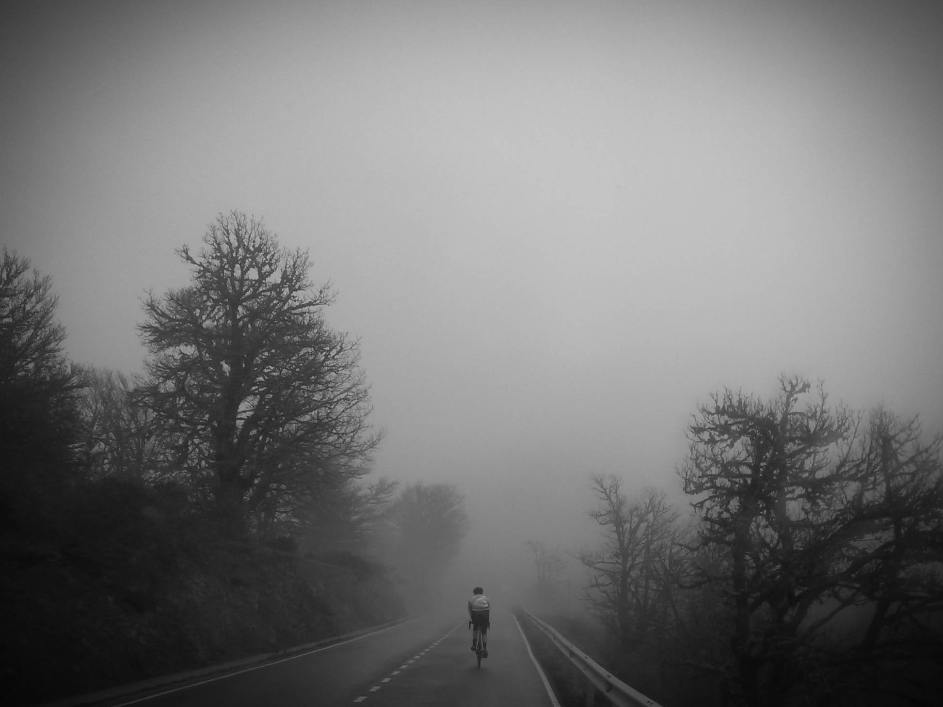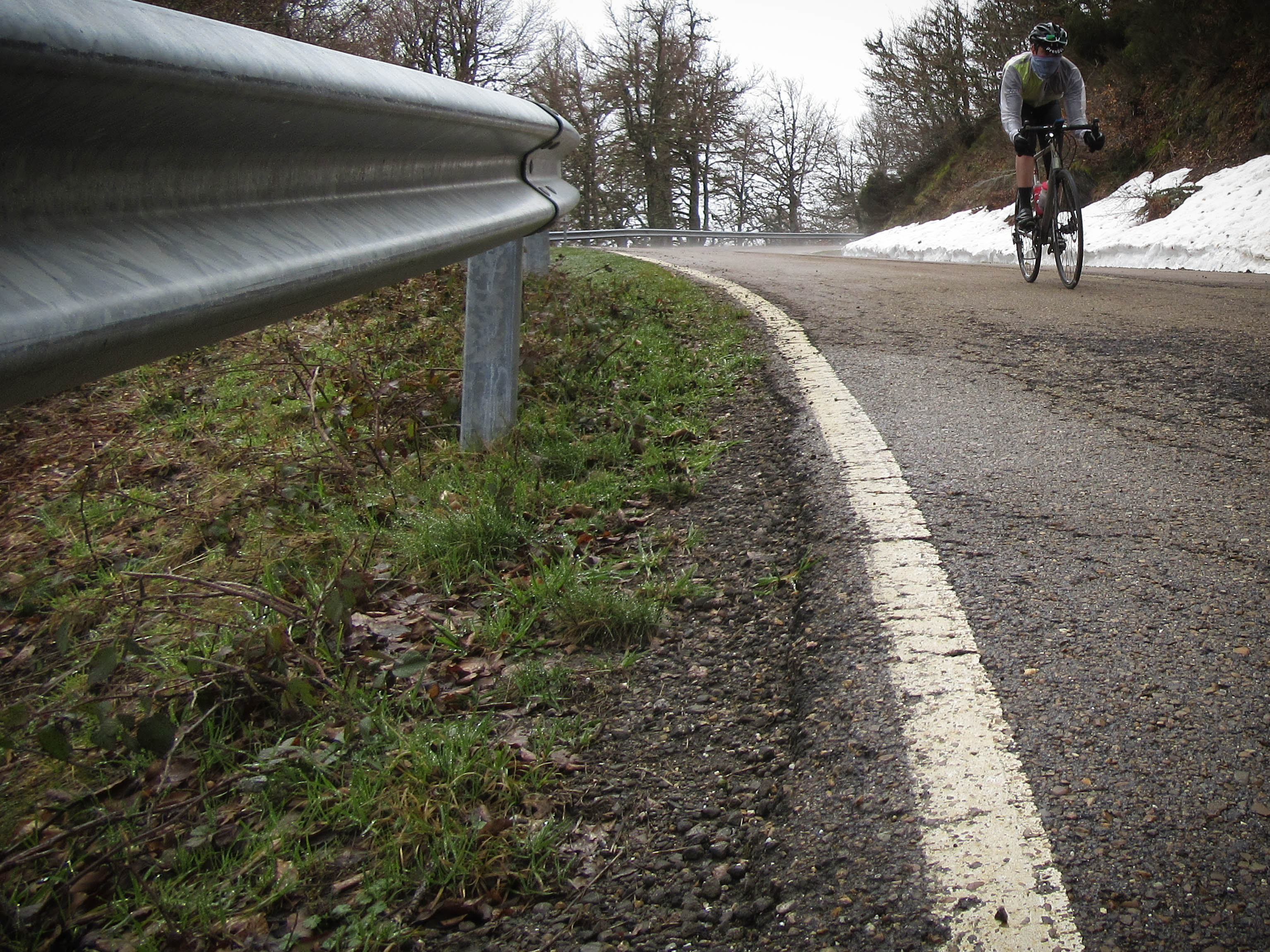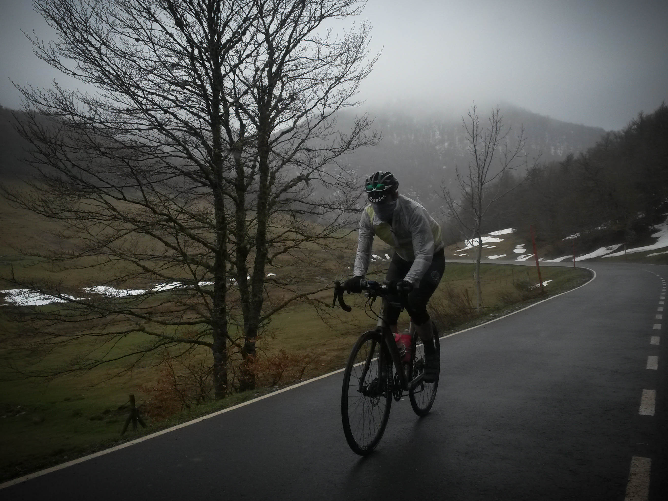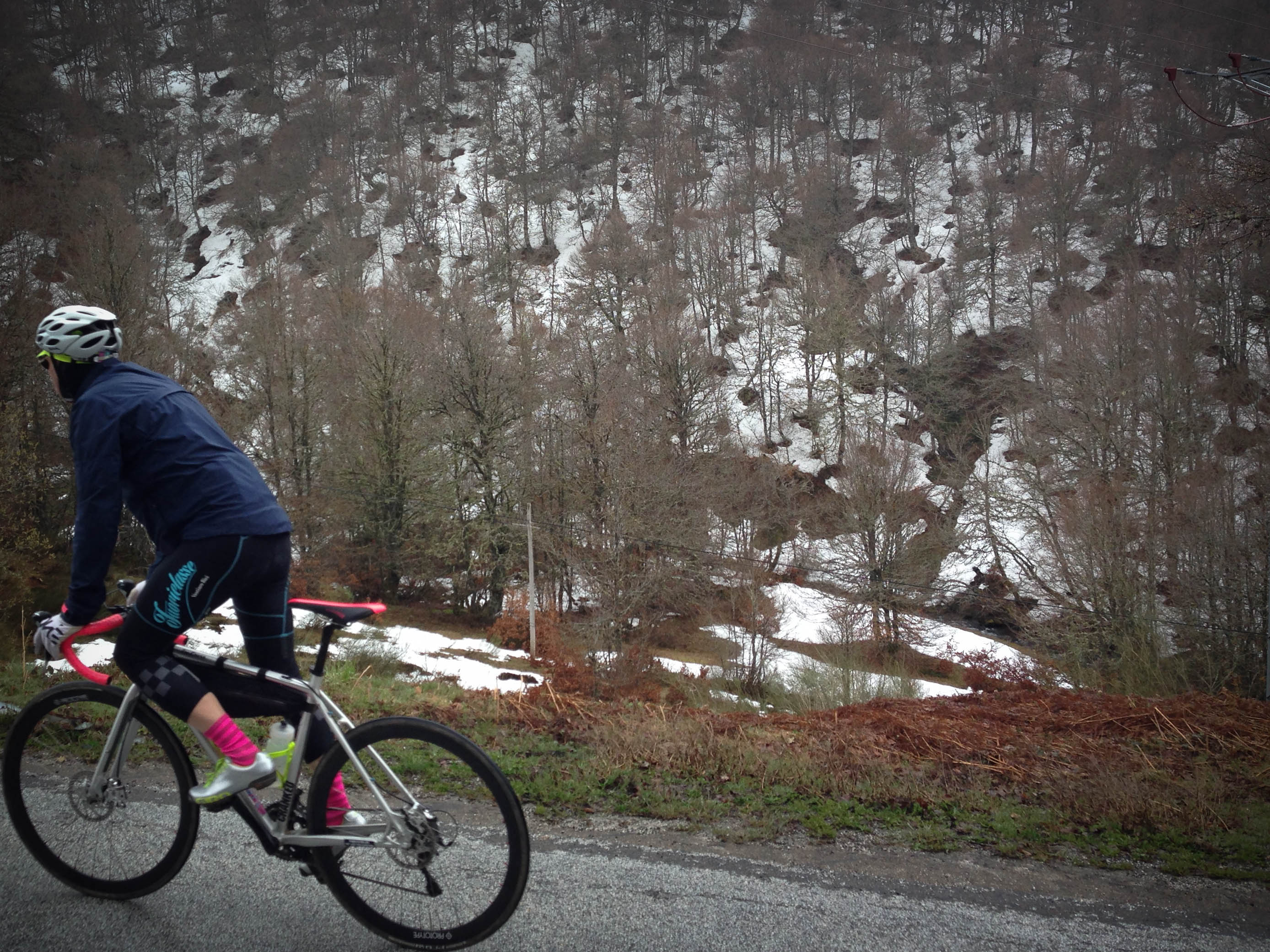 We set off wearing all of the layers – jerseys, gilets, arm warmers, knee warmers, jackets, buffs, gloves – pretty much all of the kit we have bought with us. We trace the edge of Lake Riaño before the road splits and we head in the direction of Cangas de Onis (where we stayed a couple of nights ago. The Picos are very compact, it’s probably only about 200km to circumnavigate the entire range). Despite traveling in yet another direction compared to the last two days we are still riding into a headwind, a real horrible grind it is too. There’s much muttering and swearing about wind being funneled down mountain valleys. It’s also getting greyer and colder, we’re steadily riding into cloud. Snow is lining the road and also falling from the sky. Actually it’s not falling from the sky, we’re just riding through it in the cloud. Turning from the main road onto the smaller road to the first puerto the cloud gets thicker and visibility shortens and as the gradient sharpens.