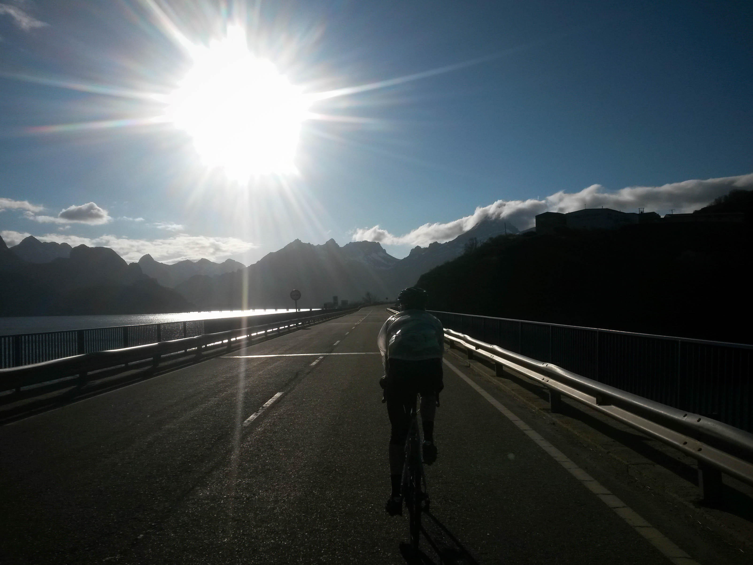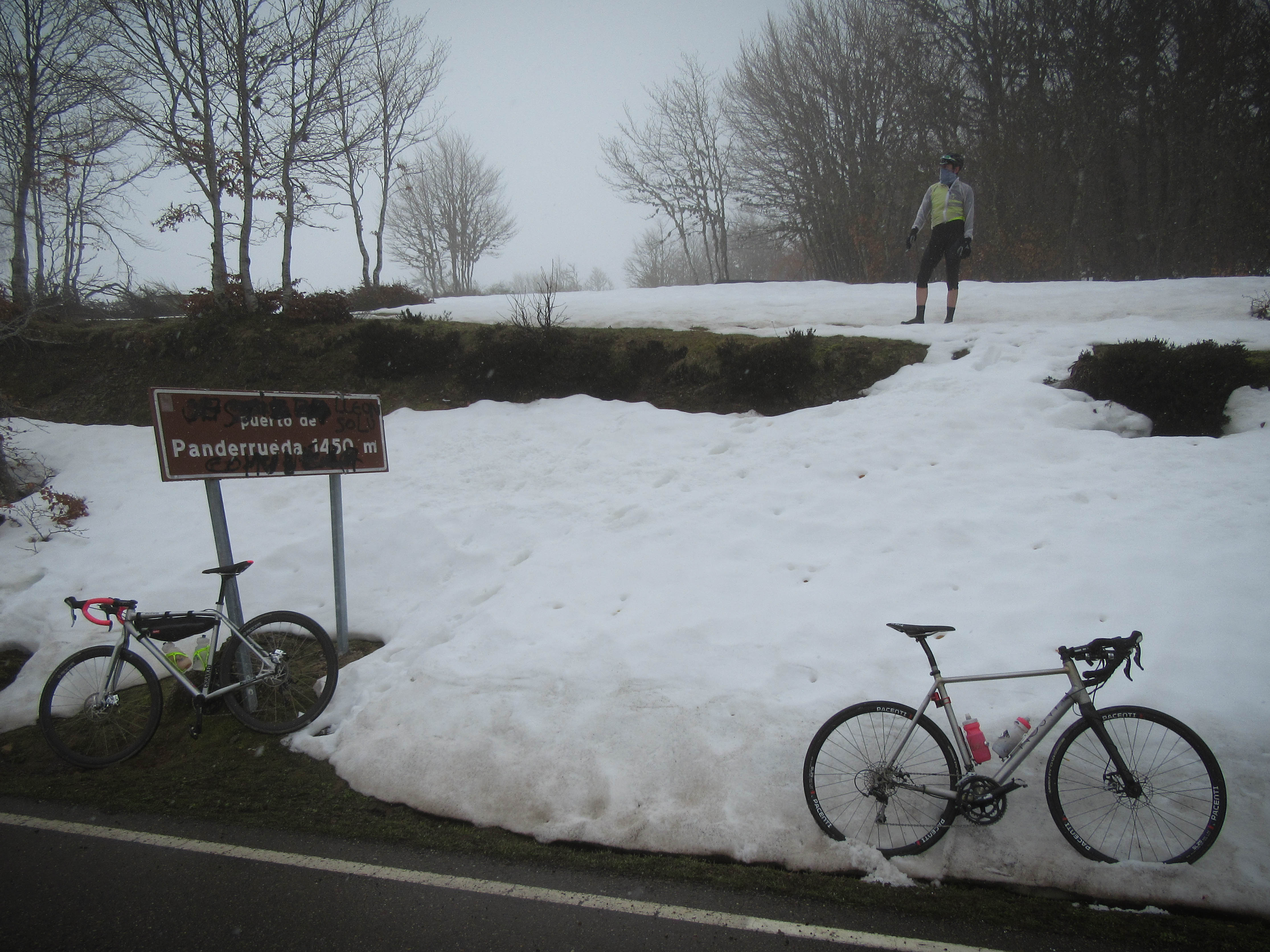 At the summit we can barely see 100 metres in any direction. It’s cold and damp, and snow flicks around our heads. We’re really not dressed for this and have no extra layers. We discuss the possibility that if it gets any worse on the other side we may just have to sack the day off as a lost cause. Concern is expressed about how sketchy the descent may be if the road is wet and slippery. We decide to ride on and within 20 metres of dropping down the other side we’re below the cloud, the road is dry, a beautiful green valley stretches before us and sunlight is bouncing off the snowy peaks in the distance. Within five minutes we’re hurtling through fast corners accompanied by our shadows. I’m so glad we didn’t bail on top of Puerto de Panderrueda in the snow.