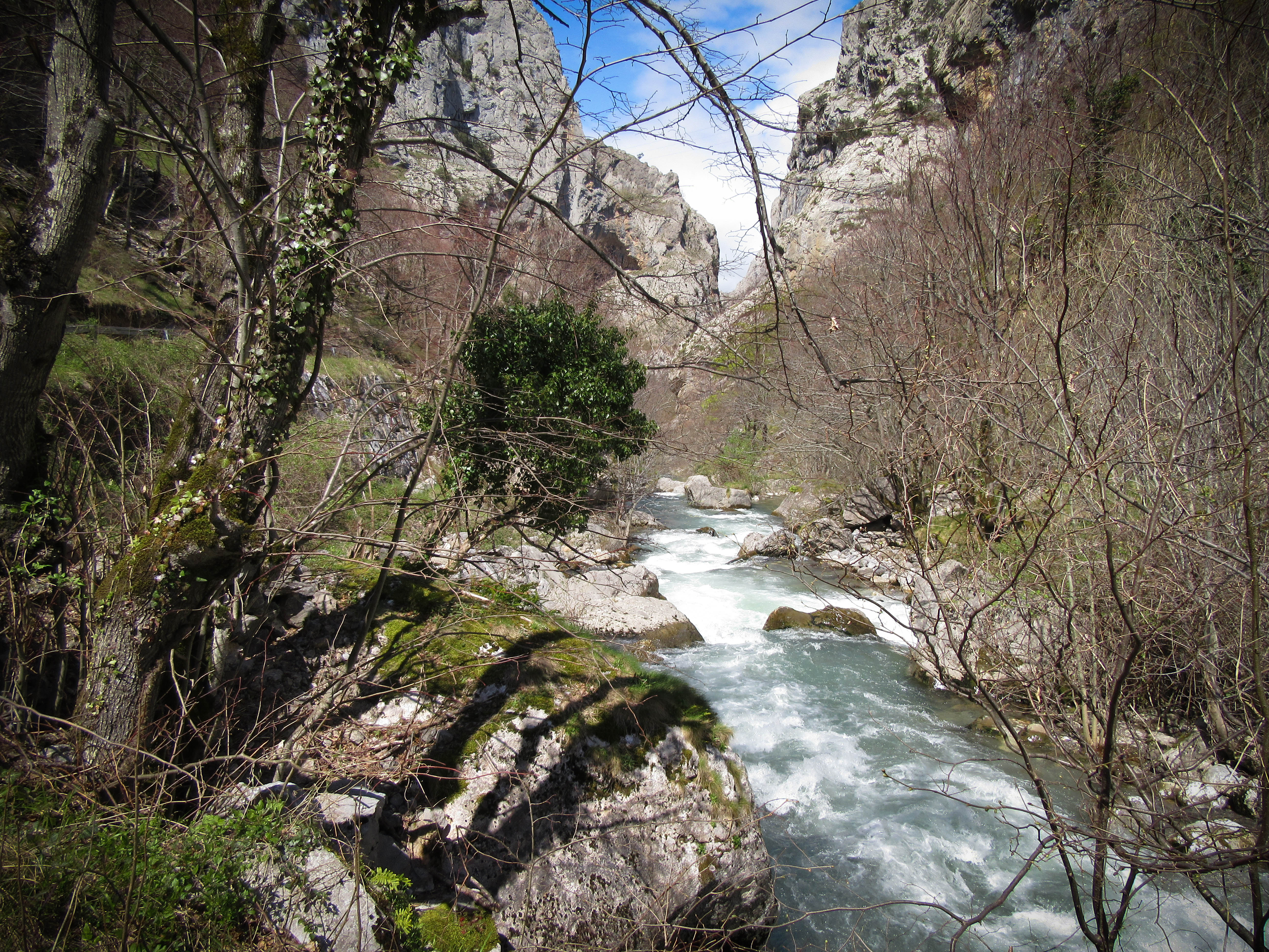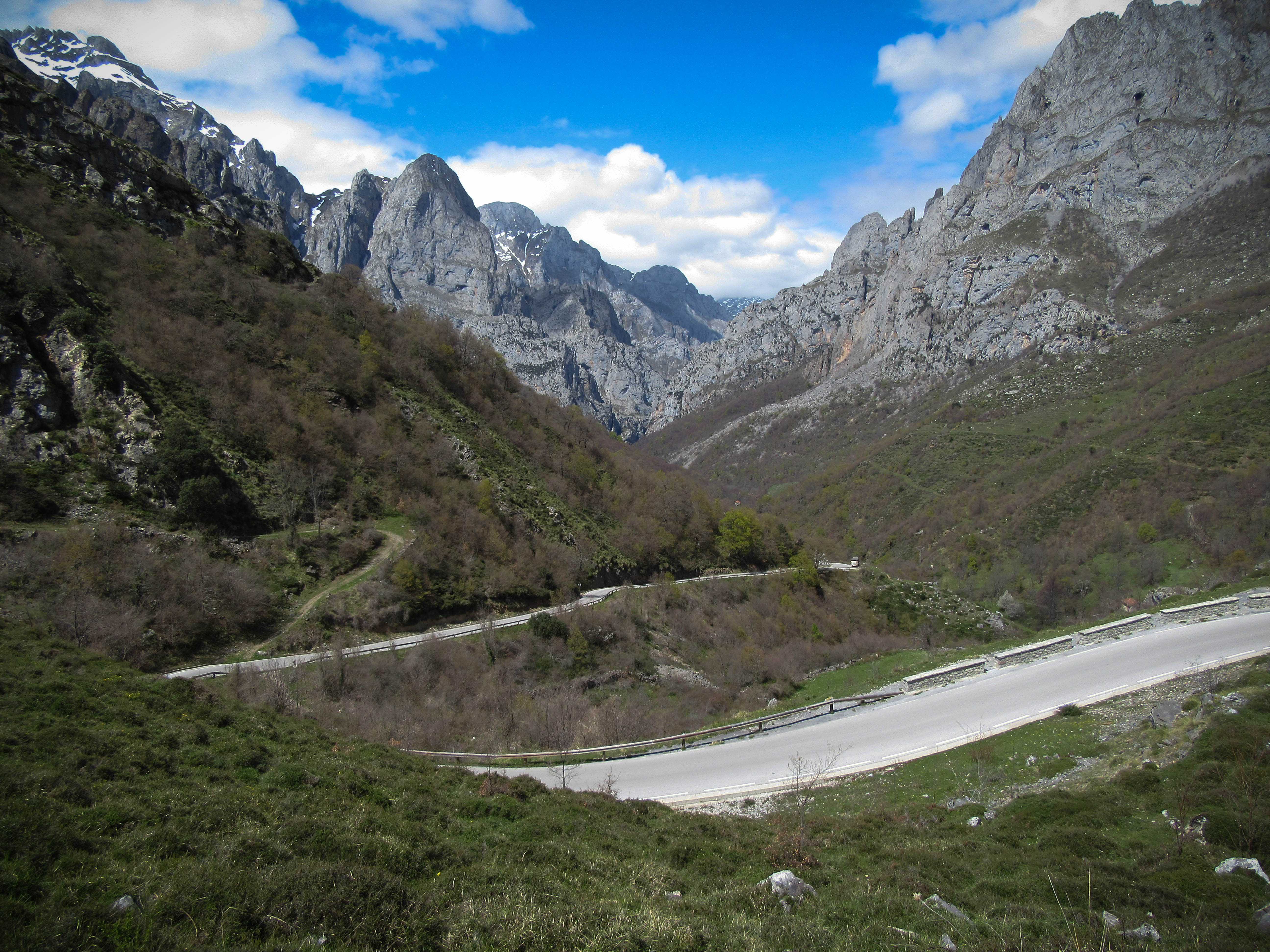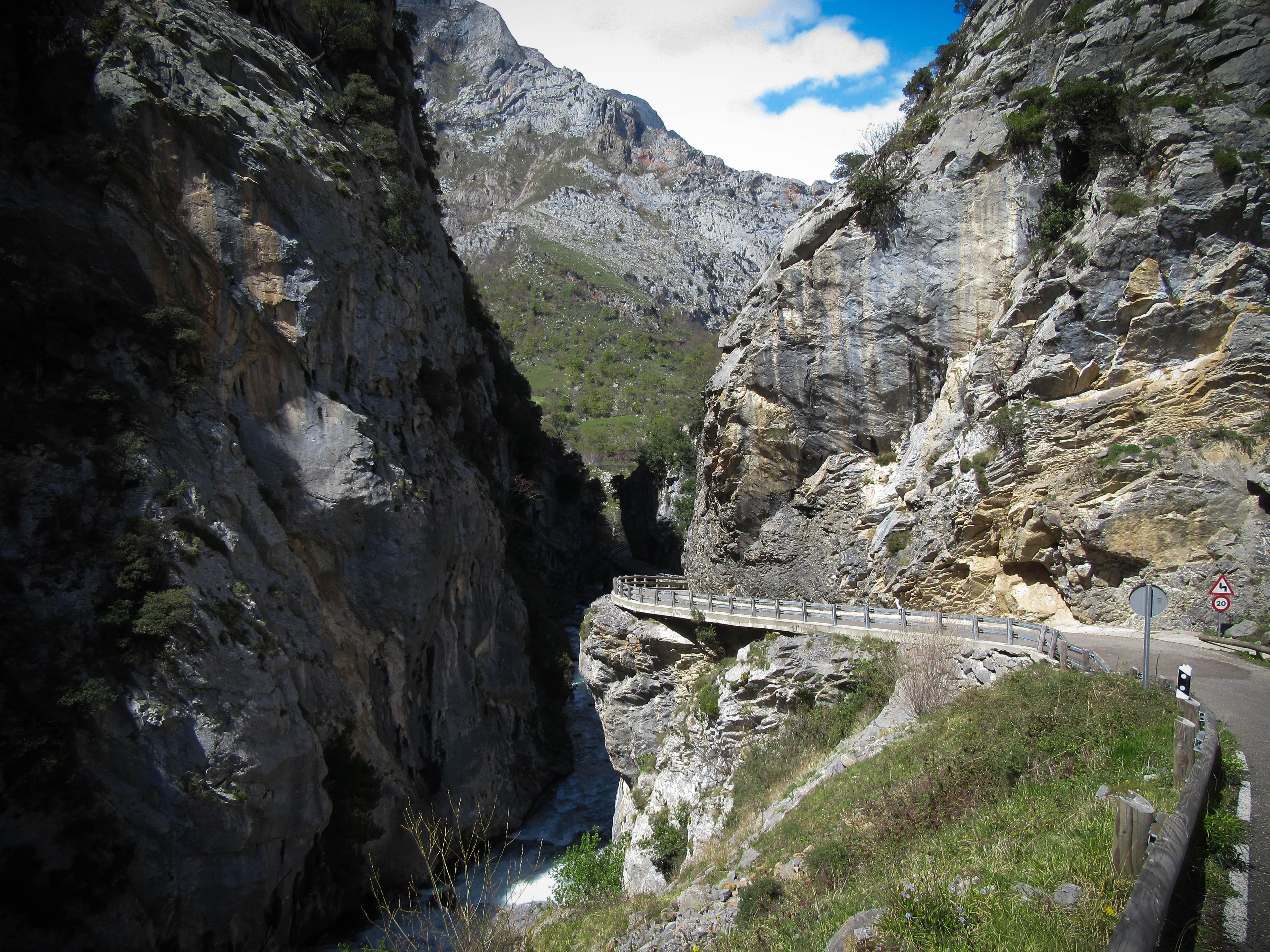 The first resident we encounter as we reach the village of Posada de Valdeón is a donkey eating a soggy cardboard box in the middle of the village square. Not sure if this triggers our decision to eat but within a few minutes we’re sitting down to yet another menu del dia and a bottle of Rioja. After lunch we head further into the valley to Cain de Valdeón. All we really know is it’s a 9km road and we’ll drop another 450-500 metres. What we don’t expect is how absolutely spectacular the road is, twisting through farmland at the top end, then wooded sections, and a narrow gorge lower down, sections of the road up to 20% (which after flying down we realise we’re going to have to clamber back up shortly), all the while massive snowy peaks rise all around us, way over 2000 metres. It truly is the most amazing bit of road we’ve ever ridden, simply stunning. Not for the first time this trip we think it can’t get any better and then we turn another corner and blown away by what we see. We follow it all the way to the end where it turns into a gravel path and disappears into the mountains. We realise the river we’ve been following and flowing past our feet further into the rocks is the Rio Cares, the same river through the beautiful gorge on the way to Panes a couple of days ago. Looking at the map we realise it’s only about 20km through the middle of the Picos back to that road, and immediately wish we had cyclocross tyres!