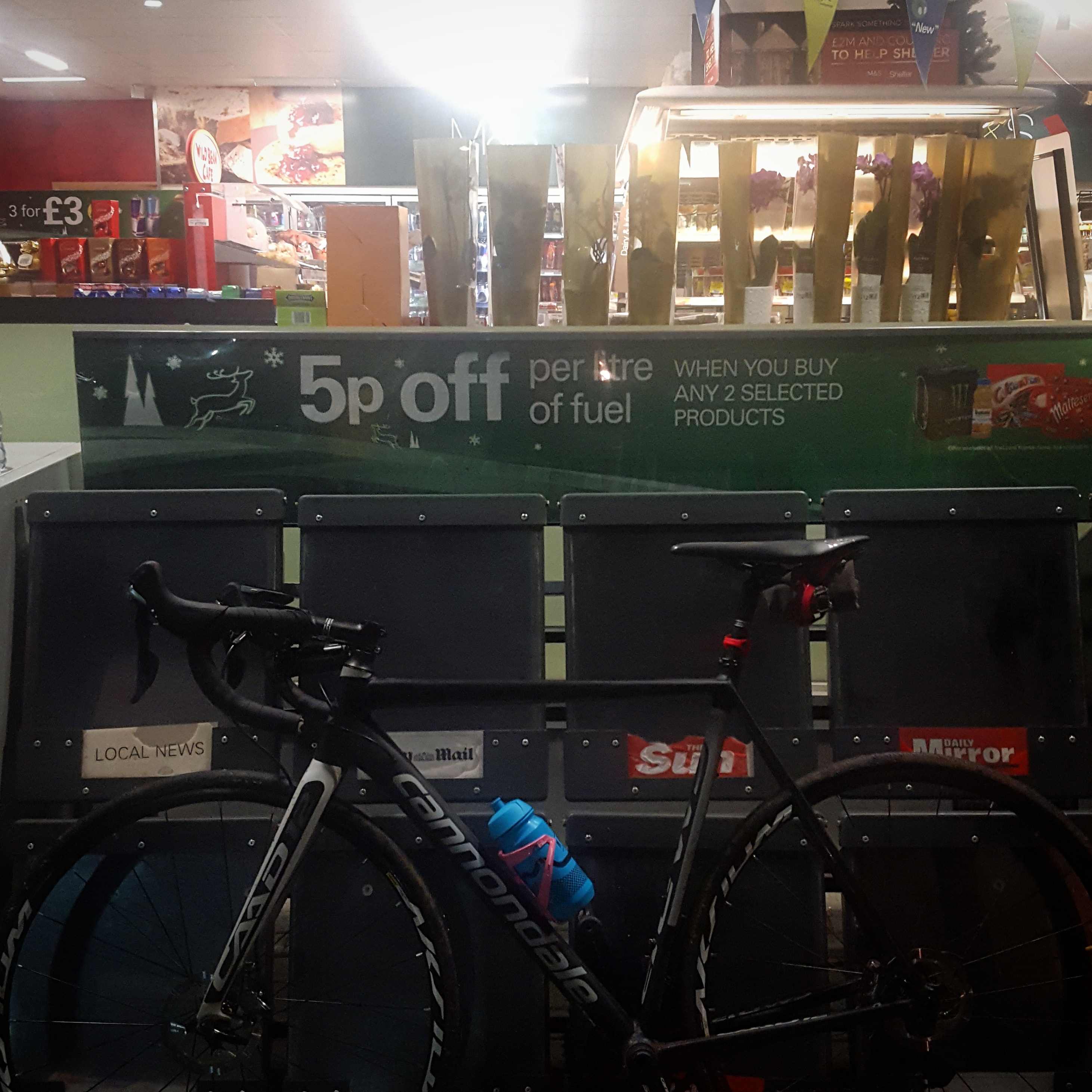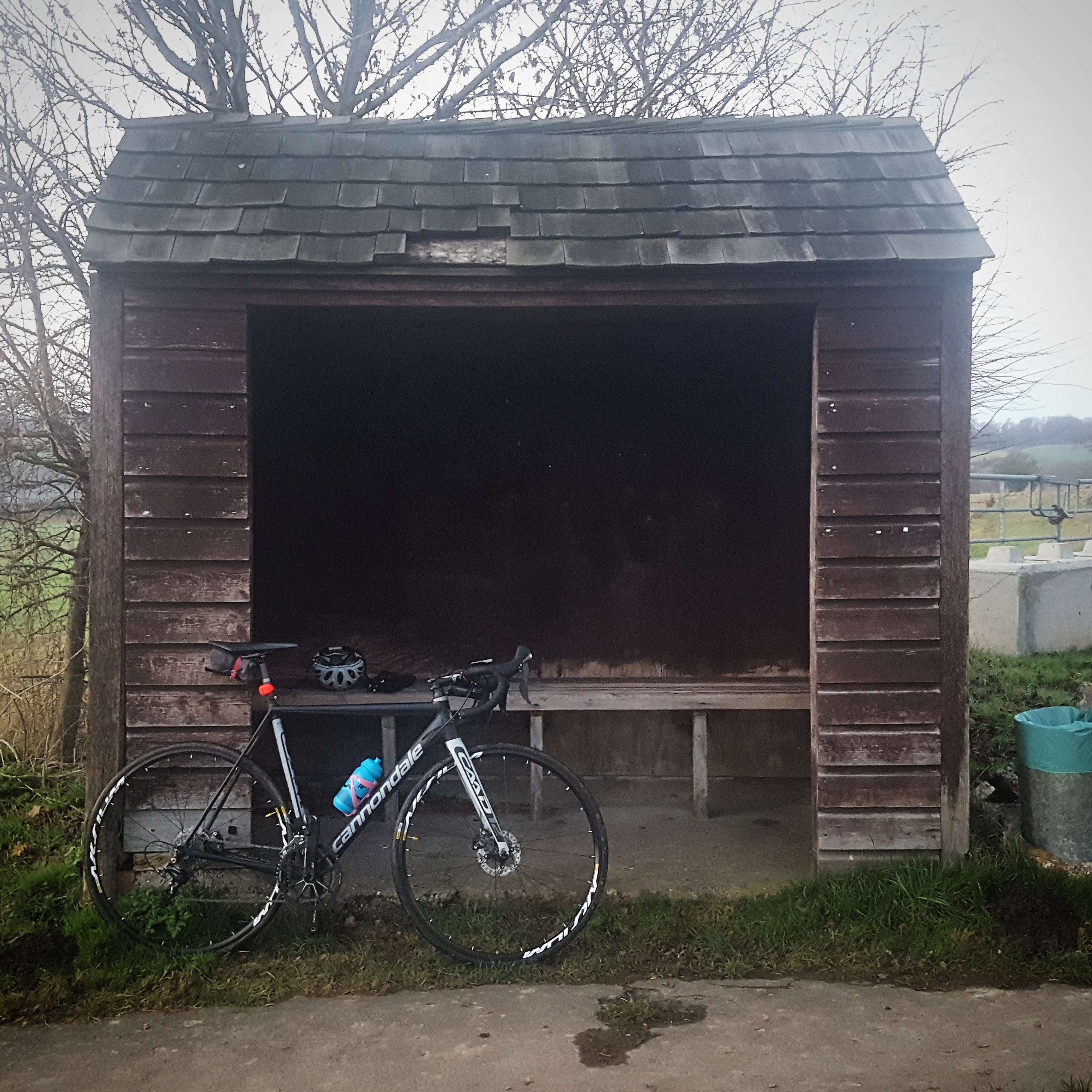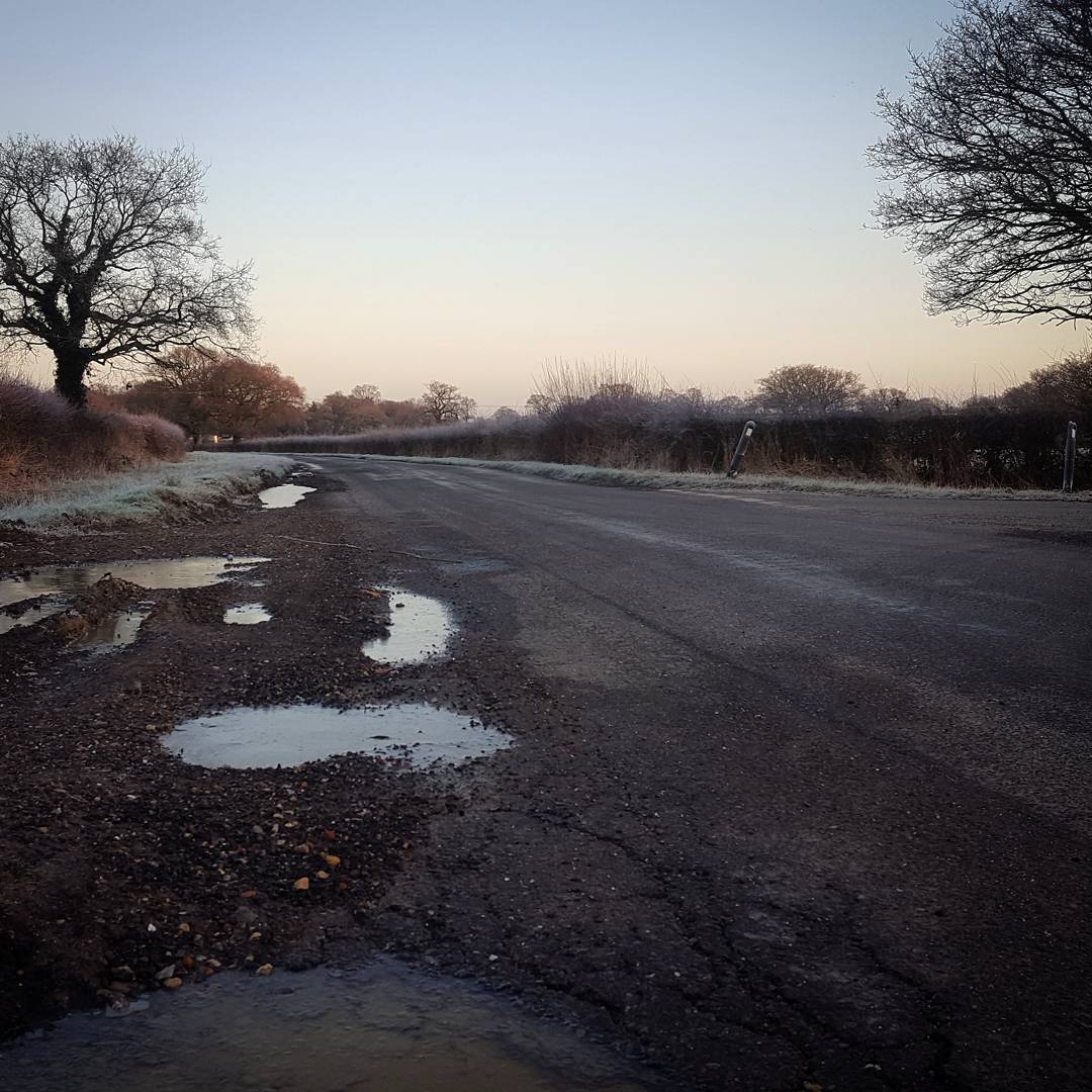 Meeting friends on a cold dark petrol station forecourt. Sunrise viewed from up the hill by the golf course, a huge orange disc seemingly rising from the silver sea. Down on the weald frozen puddles and glistening hedgerow. Icy bends in the hollows, cornering by trying not to steer, a foot unclipped and leg held out for balance. Friends turning for home on the edge of the Ashdown Forest. I continue up and over and it won’t be the last time today. Too low reservoirs. Windmills and castles. Over the motorway between the two ridges. A red London bus and another petrol station forecourt. Back over the two ridges and across the lumps as the sun rolls behind the hills of the Ashdown. Pooh Corner. Sitting in a bus stop searching for train stations on the map – too far away, may as well continue. Climbing Black Hill in the dark (again). Yet another petrol station forecourt. Eating crisps whilst staring at my feet. Nose down on the main road, finding the easiest way home.