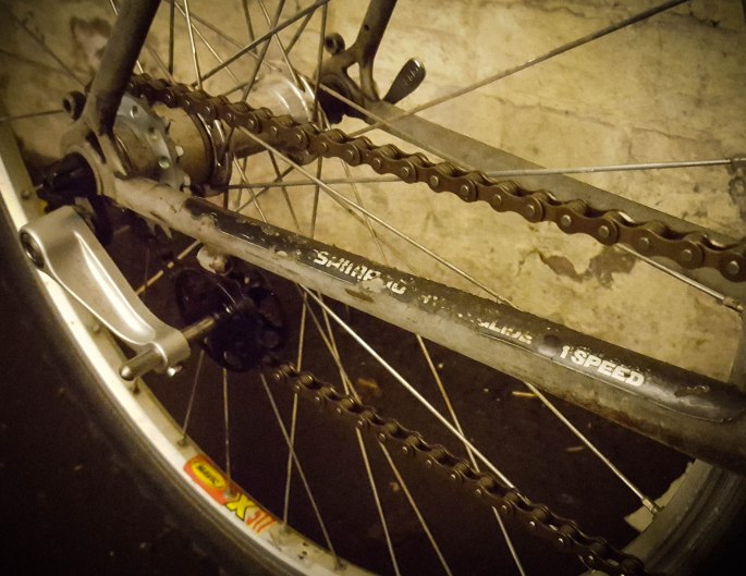 With bits dug out from the dark recesses of Jo’s shed – other histories, a multitude of stories – and a few new parts it has been resurrected as a different bike, re-invented as a singlespeed. The first bike I’ve had with only one gear since a BMX (Prolite) when aged 14. It’ll probably make me hurt and swear but commutes over the Downs should be interesting. However having just ridden it home I reckon it’ll also be a hell of a lot of fun! It’s nice to have you back Marin.