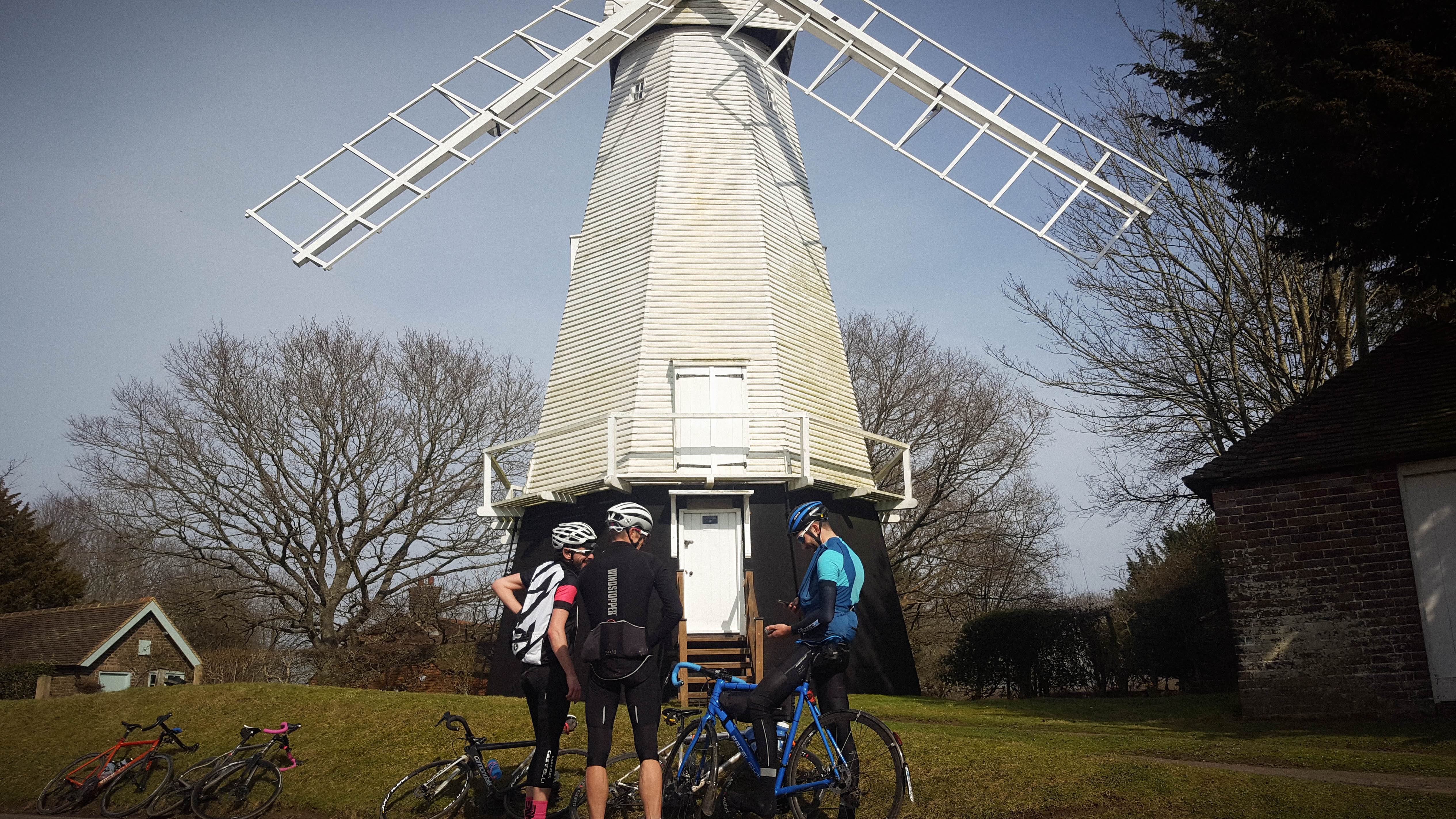 Sailing around Sussex with friends searching out windmills. All eight listed on the brevet card found and logged. At the almost the exact midpoint between the starts of meteorological and astronomical spring, it was the first ride in what felt like spring. Gloves off and jerseys unzipped. Riding with shadows and laughter.