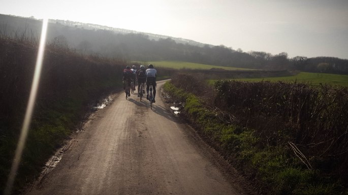 It didn’t start out like this. Setting off along the coast, the sea fret hid the view beyond the cliff edge to our right. We barely caught sight of the first windmill up on the cliff. In and out of the Ouse and Cuckmere valleys we turned inland, away from the Downs and fog for the first ride across the marshes of the year, or simply the first time for some of our small peloton. Hazy horizons and diffuse sunlight. Climbing to edge of the hills of the High Weald our shadows flickered into life. After bagging the fourth windmill and almost half way round we stopped at a garden centre, sat outside in the sunshine with tea and bacon sarnies.