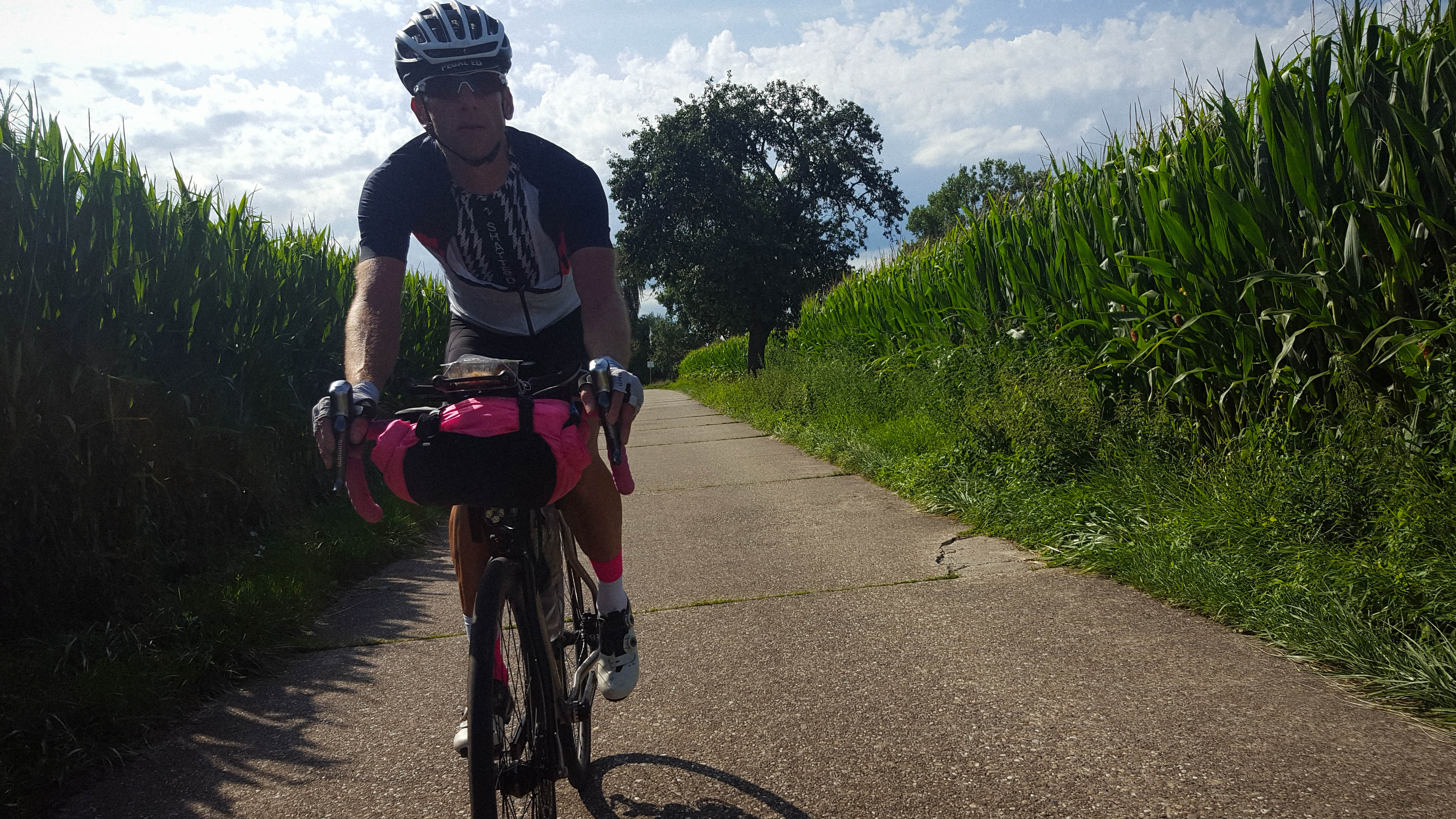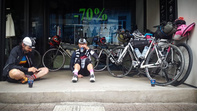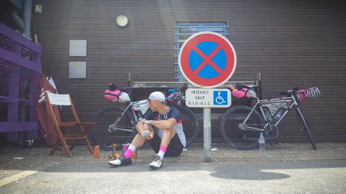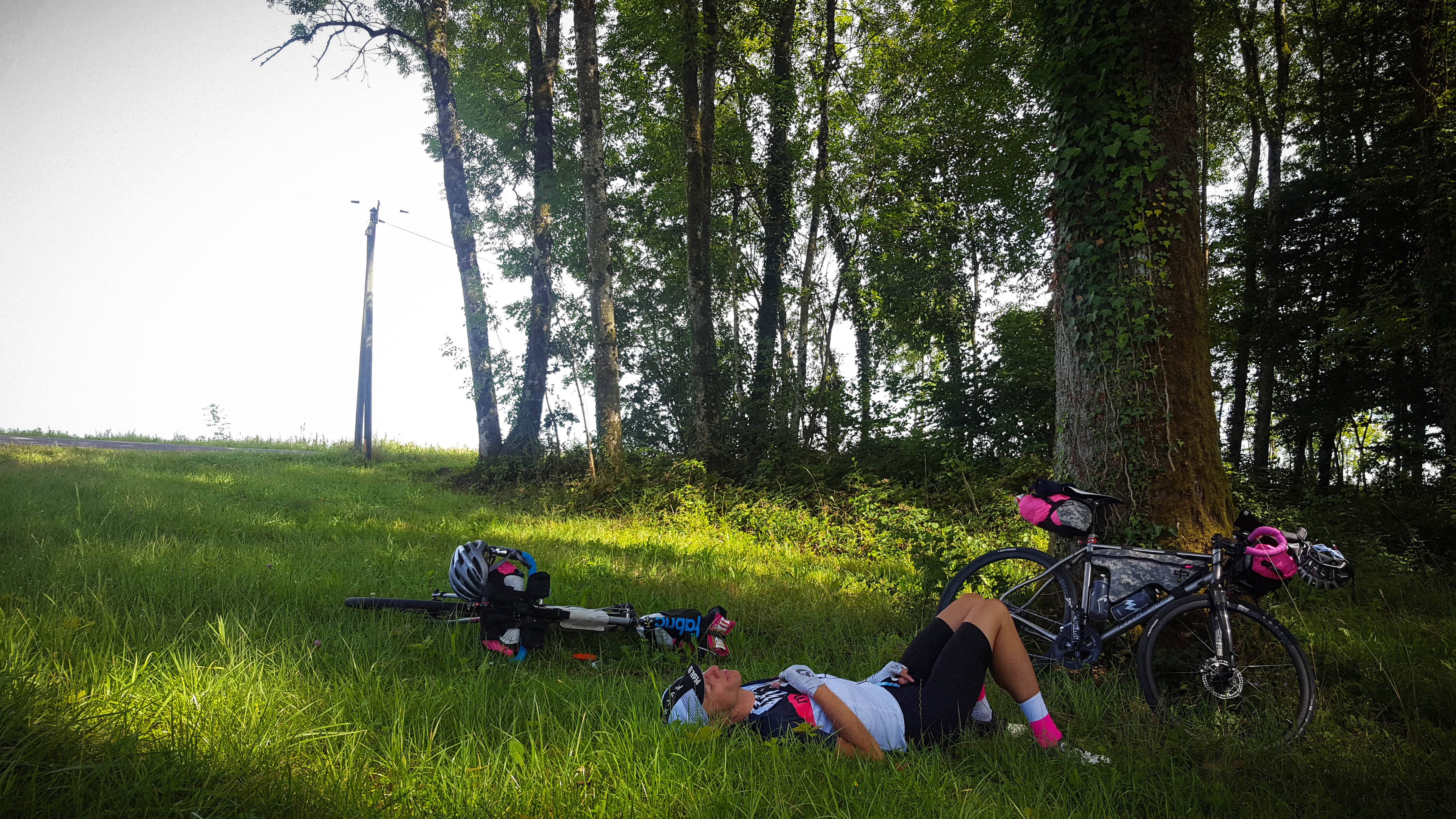 George has a quick pre-race snooze.“Hey George, you’re not carrying those jeans and trainers all the way around Europe are you?”Waiting for the last supper with George and Jo (and Jesko, out of shot)A minute’s silence, a minute’s raucous noise, and we’re off.On our own in France within hours of starting whilst everyone else heads through Belgium towards Luxembourg or Germany.A quick nap by a church near a town where a big rave was going on.Another quick nap whilst we wait for the boulangerie to open. Route notes and Google maps indicate this may be the last chance for a while and we’ve ridden all night on water and a couple of energy bars.France. Not sure where. Long not quite straight not quite flat roads.Lunch number two.Afternoon nap. I awake from this to a message from George to check my email. Fellow racer Frank Simons was killed in a hit and run incident in Belgium in the early hours of this morning.The first of many cemetery taps. We’re in the middle of a heatwave and water is clearly going to be an issue.Second dinner and breakfast after deciding to crash in a hotel for the night.Between Metz and Saverne.France. Not sure where. Long not quite straight not quite flat roads.Experience tells me to carry spare food at all times on a Sunday in Europe.Out of Strasbourg.Somewhere in Germany.Late afternoon nap.Looking back down at the Rhine valley after getting caught in a thunder storm half way up a very big, very steep hill. The sign at the bottom said 18% average. All 8km of it.Somewhere between Freudenstadt and CP1 early on Monday morning.