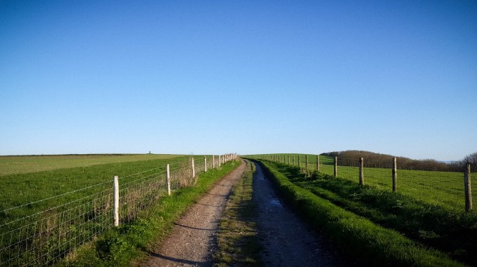 I stop for a moment to take in the view back towards the sun. Stretched shadows and the shimmer of early morning soften the hills. I rode those hills two days ago under low grey skies. A skylark sings. A song implicit of this place, heard out of context a sound that, without fail, evokes home and warm hillsides. Chalk and flint under wheel. I pass the trig point and splash through puddles. A lone figure is further along the ridge, a red jacket vibrant in contrast with the green and blue that fills the rest of the view. It takes two dips and one slight rise to catch them. I slow and say “Morning!” to Angus and we continue the route together.
