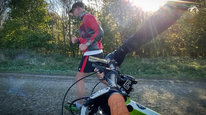 Along the river under the flyover I ride in the shadow of the hillside. By the time I cross the river it has breached the line of the hill and I cast a long shadow. Into the trees briefly, a sharp little climb to a gate, then to the pig pens. The sound of my breathing fades as the gradient eases. First gate. Second gate. The back wheel slips on the narrow muddy line that almost runs parallel to the fence. My tyres press their patterns into recent footprints in the mud. Is this the way Angus is running?