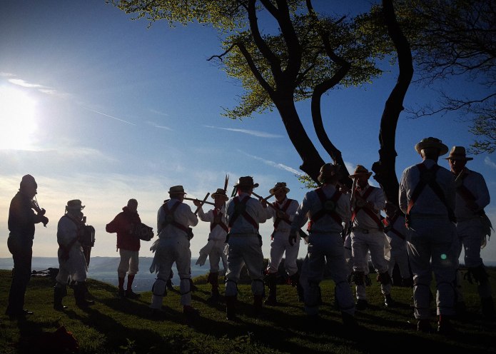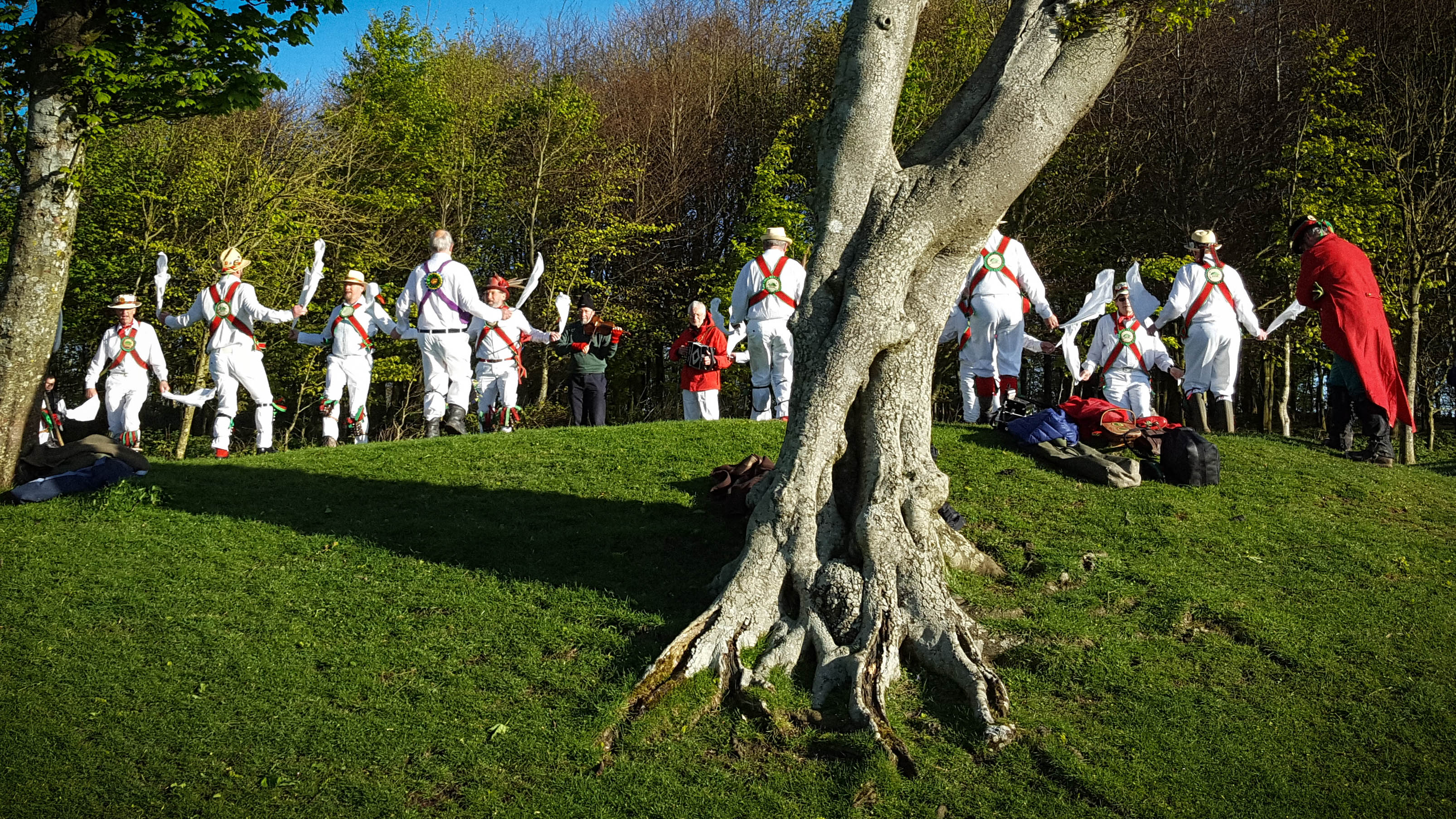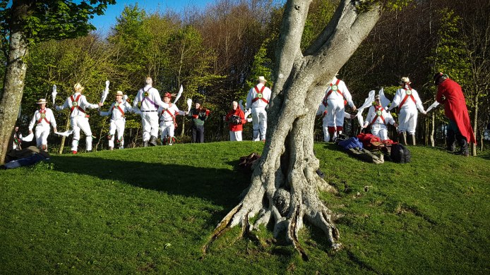 I rattle across the cattlegrid as Angus passes through the gate to it’s side. Above us, ahead white figures dance amongst the trees, the Chanctonbury Ring Morris Men. This is why we came, to meet Spring. From among the trees I see the sea to the south, and to the west the familiar shapes and shadows of the scarp slope – Truleigh Hill, Devil’s Dyke, Newtimber, Ditchling Beacon. I can see home and the Ashdown Forest floating above distant mist. Almost all of Sussex, both of them, East and West, are visible from here. The dancers finish with a song.