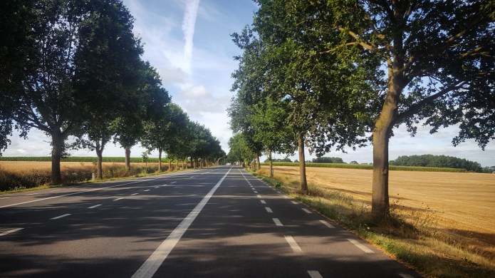 Breakfast from a petrol station. Boring roads. Headwind. More boring roads. It might be the hangover and the headwind but I’m not appreciating Belgium. When do I get to France? Big messy roads, French places on signposts, must be nearing the border. Road number prefix changes from N to D. Oh, that’s the church we had a nap at on the Transcon last year. It’s getting relentlessly hot. And that wind can do one. Long straight undulating roads like only the French can do. Stopping for water at every opportunity. Field after field after field after field after field… Where the hell is Riems? The last few kilometres take an eternity.