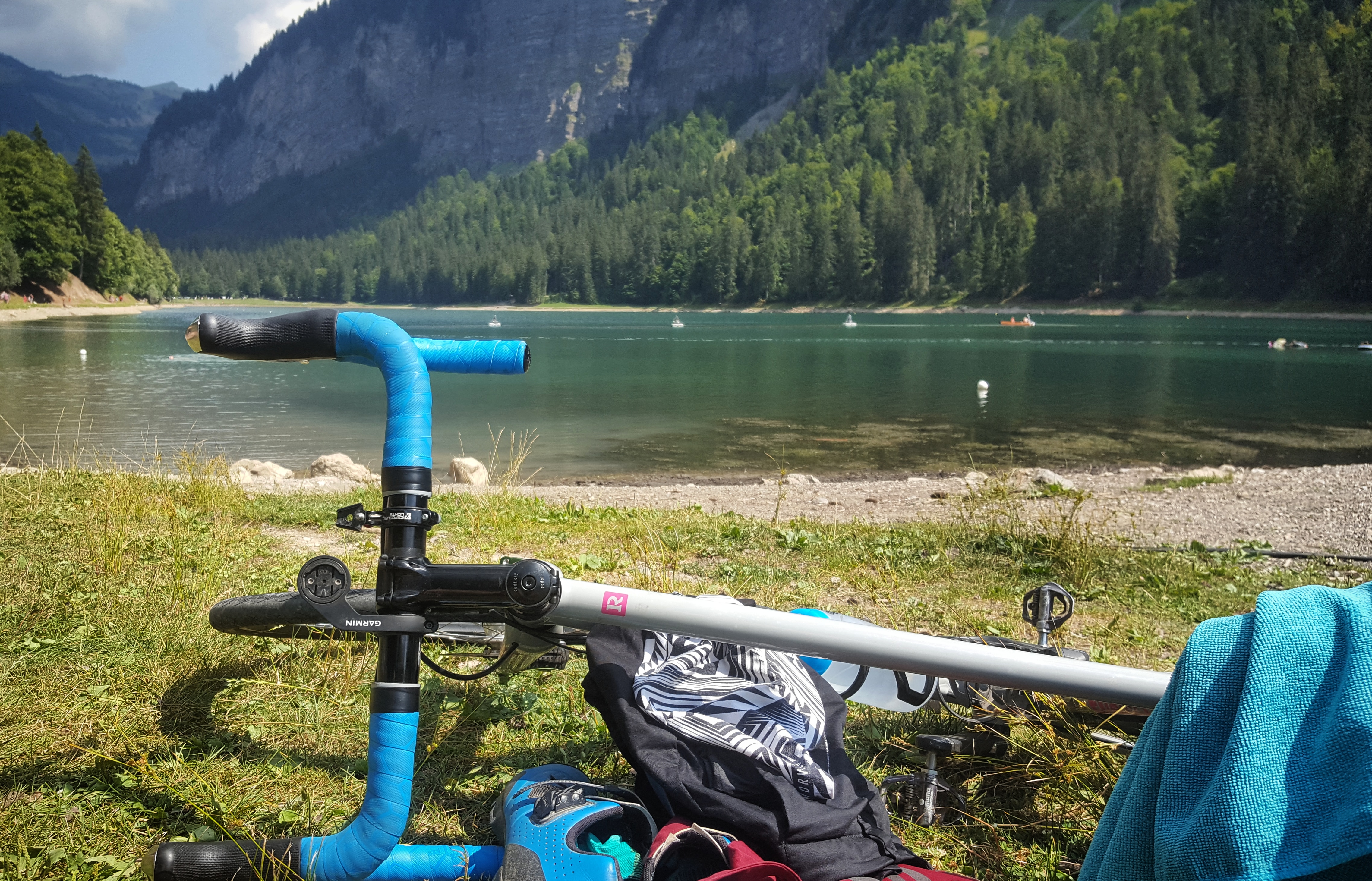 Out early whilst it’s cool. First up (literally) Col de Corbier. Coffee at the top. Sweet descent through hairpins and fast straights. Damn, I want to ride up these. Up a different valley that feels properly Alpine and quite a bit Swiss, all pine trees and meadows and wooden chalets. Through Châlet to the Pas de Morgins, the Swiss border, freewheel a couple of k’s into Switzerland before turning back for an early lunch in Châlet.