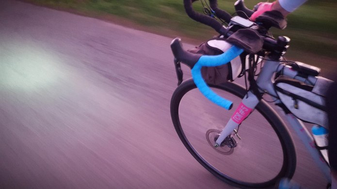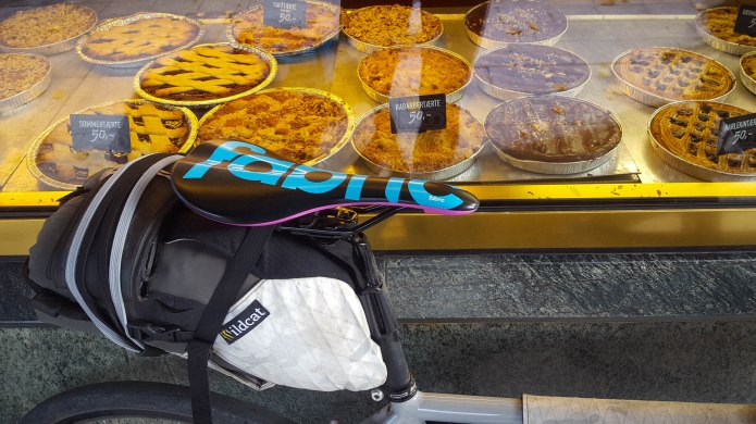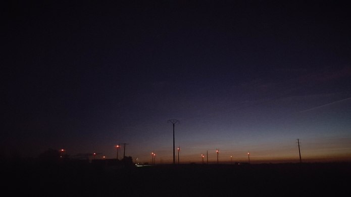 The smell of baking bread wafts through the air as I climb the hill away from the ferry. The streets are still and quiet. Beyond the light pollution stars prickle the black sky. The air smells of recently ploughed earth and the sound from wind turbines overhead accentuate the strength of the wind. For a couple of hours I ride in darkness, red lights on turbines blinking all around. The huhuhuhooo of a tawny owl somewhere in the woods. The land feels familiar, I’ve ridden this way before, rolling through farmland and woodland, but maybe not these exact roads. Descending gently into a village I spot the glow of a patisserie, first stop of the day. On a bench under a tree on the village square I sit and eat breakfast.
