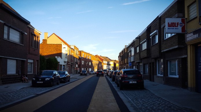 I play hopscotch with the border, which follows the middle of the river with odd little deviations beyond each bank occasionally, for a while until crossing a bridge the signs and languages change and I’m definitively in Belgium. I hug the river with occasional detours into towns and around industrial estates. I pass through places made famous by the spring classics; Wevelgem, Harelbeke, Kuurne.
