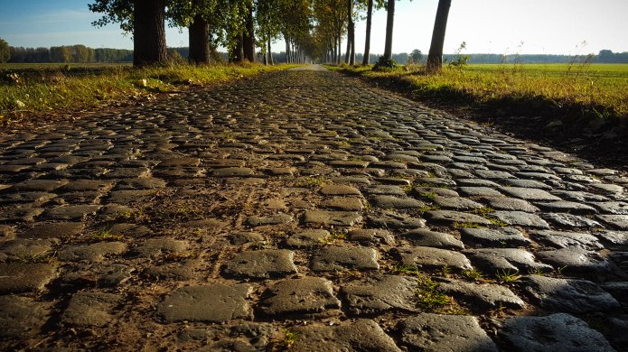 I wake up late and make the most of the breakfast buffet, it’s going to be another long day. Not as long as yesterday but over 200 kilometres. It’s not too much of a concern though as it is going to be very flat and according to the forecast I should have a cross-tailwind all day. Out of Ghent my route passes through many nondescript towns that remind me of those mid-week non-World Tour Belgian not quite Classic races you see on Eurosport in spring. Soon the towns give way to countryside and long straight tree-lined roads. It being Flanders cobbles make their presence felt now and again.