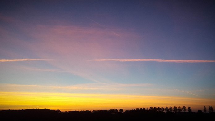 A second breakfast with petrol station flowers. Is the light softer, paler today? A slight haze or dirty glasses or tired fuzzy eyeballs? Probably all three. What day is it? Trees glow golden in the early light.
