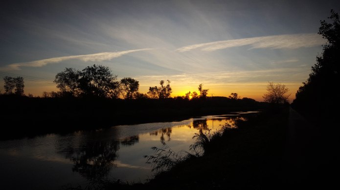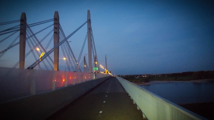 Ice Tea and a Magnum on the edge of Tilburg. More straight roads, canal paths, and a dyke that snakes along the river Waal. A sinking feeling as I turn onto what I expect to be a bridge that turns out to be a little jetty. Shit. I didn’t realise there was a foot passenger ferry on today’s route, and there is absolutely no sign of one. Clearly at sundown on a Sunday there are no ferries.