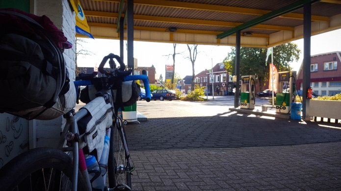 Third day tiredness is combatted with double espressos all day long. I stop for the night in a town where nothing is open (seems Monday is the quiet day in the protestant countries) except Lidl. A seven euro random-picnic dinner in a motel. I wash my kit in the shower and fall asleep.