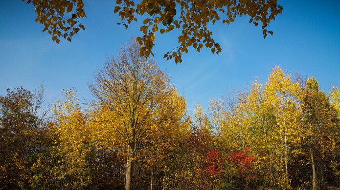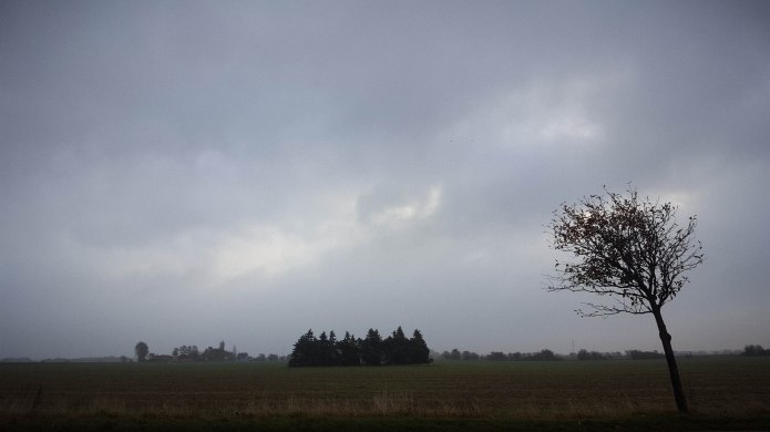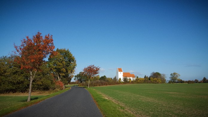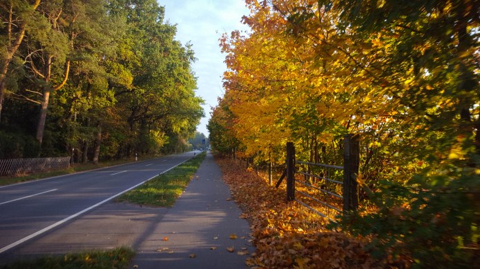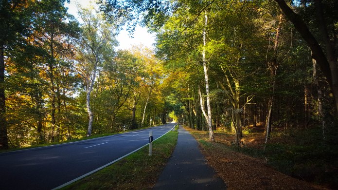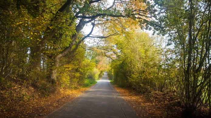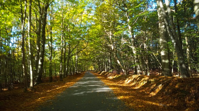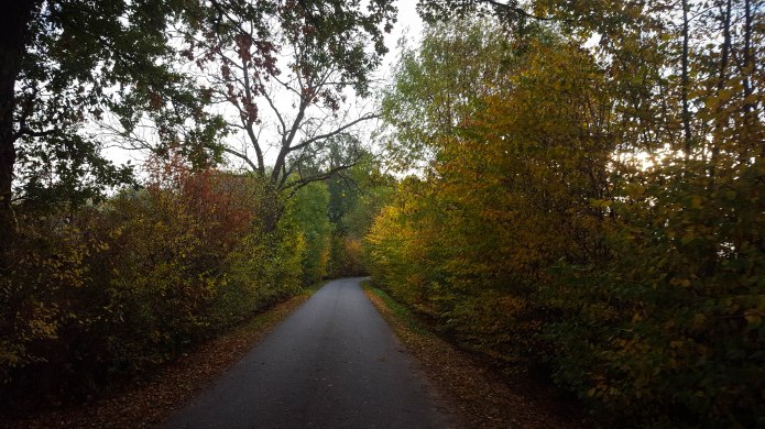 Out of town the hills start. Ok, they barely count as hills but compared to anything I’ve seen since France they are hills. My legs are telling me they are hills and added to the wind the going gets slow. In a tunnel of trees the wind picks up and I find myself in a snow globe of yellow leaves. Never far from the sea I catch glimpses regularly, and ride along the edge of a fjord for a while.