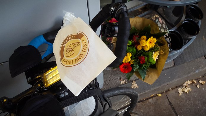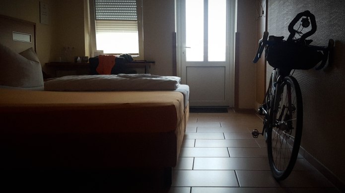 250 kilometres ridden and energy is flagging. Crisps and Fanta from a vending machine in the middle of nowhere. A digital display shows 18:30 and still 23 degrees. Flickers of cramp. Head down, let’s get this done. The next 20 kilometres drag. I track railway lines to the edge of the city centre where I transfer from the smooth cycle path to cobbled streets and look for my hotel. I start thinking about dinner and beer.