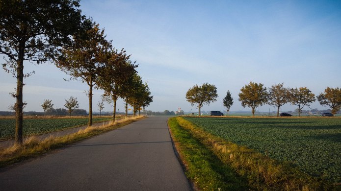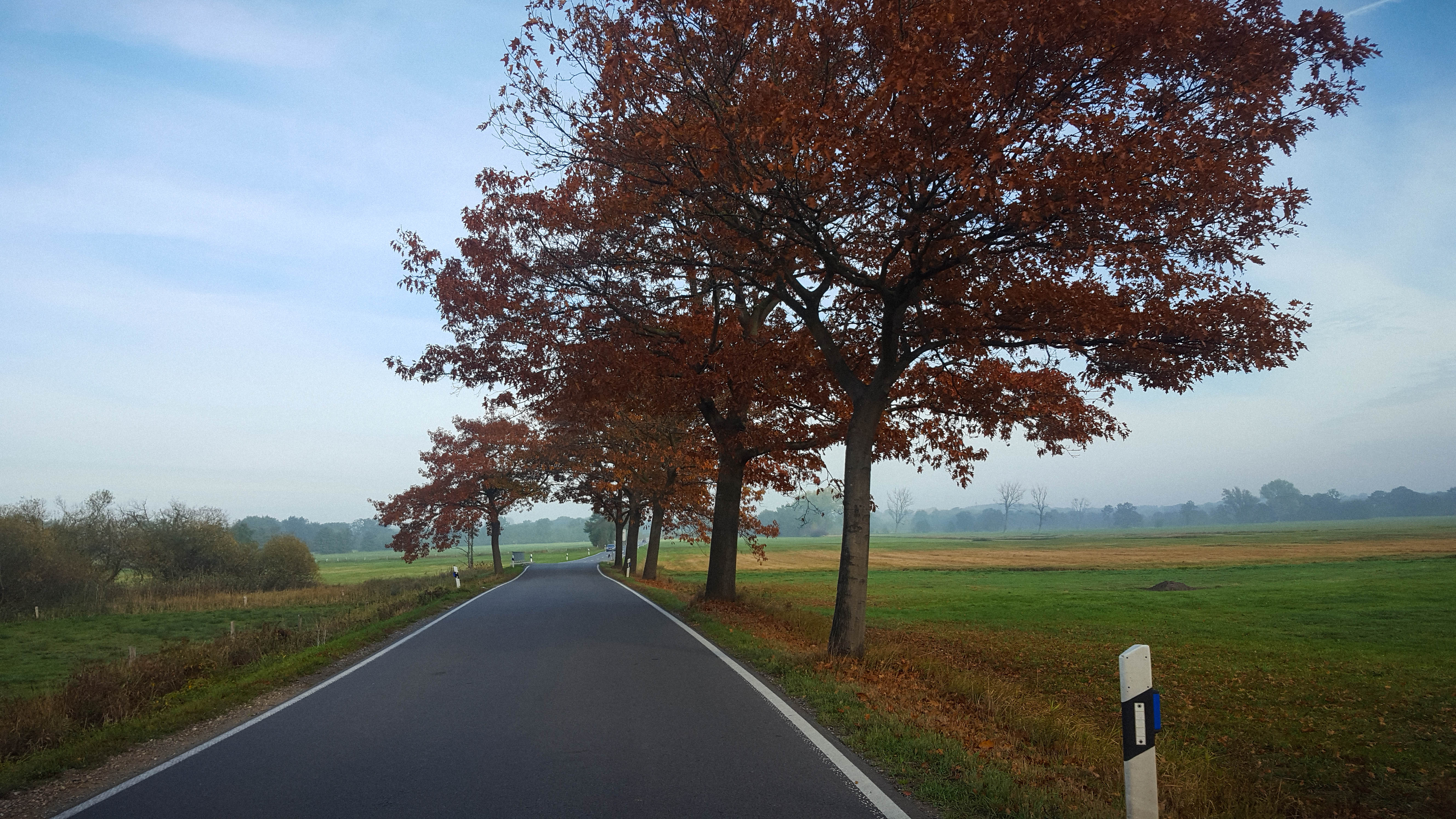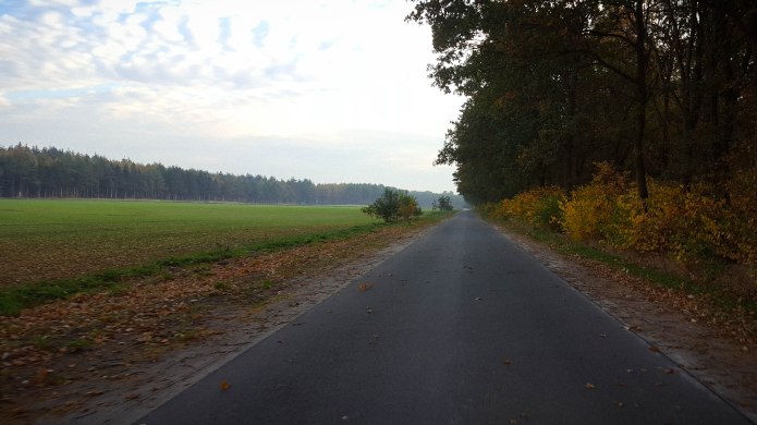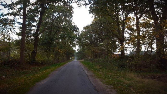 Other than that a day of long straight flat roads and autumn colours. Towards the border the land becomes more agricultural, big farms and large fields. Many stables, horse country. There’s a feeling of mid-west America. With no hills or mountains the landscape reveals it’s changes slowly and subtlely. Netherlands all very neat and tidy, lots of waterways. Germany a little messier, a little more undulating, just as many waterways. Architecture becomes more austere and imposing. Red brick and green paint. Three cats sit on a stable door, looking like an 1970’s Athena poster. I’ve seen more windmills in Germany than the Netherlands. On a map a border may be a distinct line, in reality countries blend together gradually.