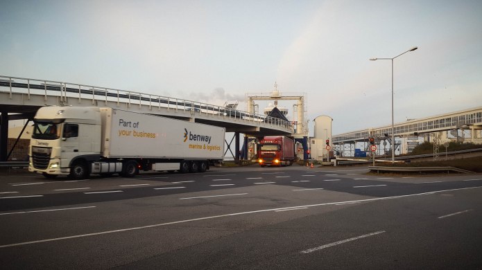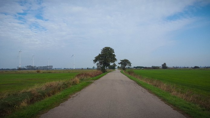 More and more straight roads. A change in the land, nearing a river, a hinterland that reminds me of Essex north of Tilbury. I always feel there’s something sinister about these places. Reeds and red tipped turbines. A bright orange ferry over the river whilst eating a pastry.