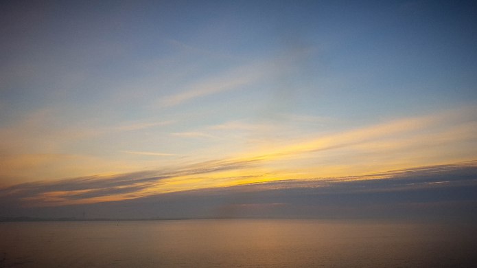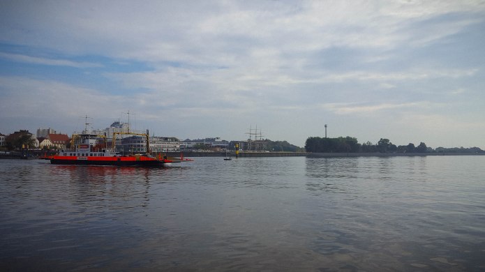 Up and out with the commuters and school kids at bus stops. A drop of chain lube on a squeaky jockey wheel. Rumble across a metal gantry onto a ferry jetty. No sign of a ferry or people. After Sunday, paranoia that I misread the online timetable. I’m sure I double checked, the winter timetable started yesterday so only mornings and evenings from this week. I don’t want to have to ride into Hamburg to find a bridge. With my mitt I wipe the dew from the timetable pinned up. Yes, 8.10am for the last ferry of the morning. I’m half an hour early. A fruitless lap of the houses looking for coffee. When I return there are commuters on the jetty watching the sun rise above the Elbe. From behind a container ship the small yellow ferry appears.