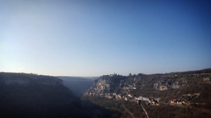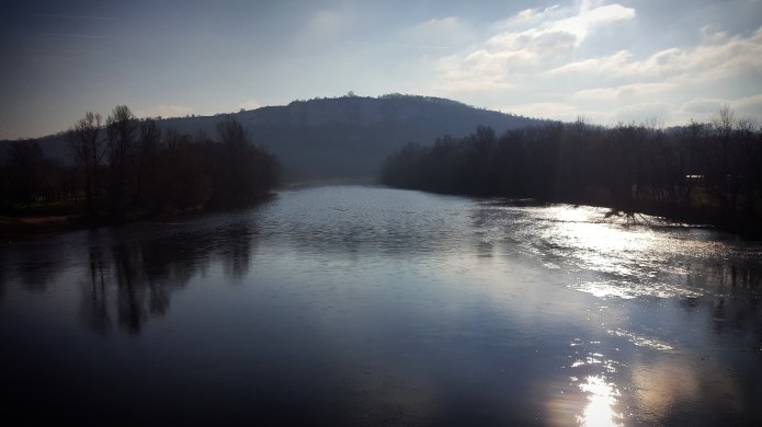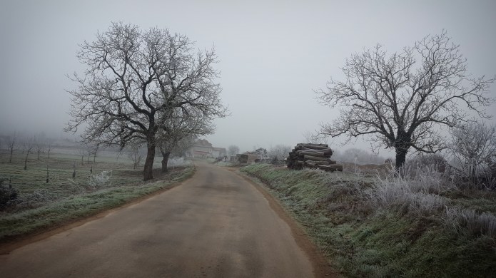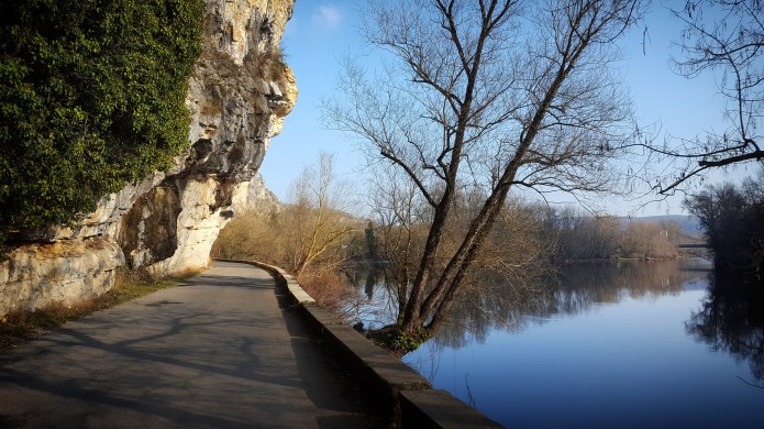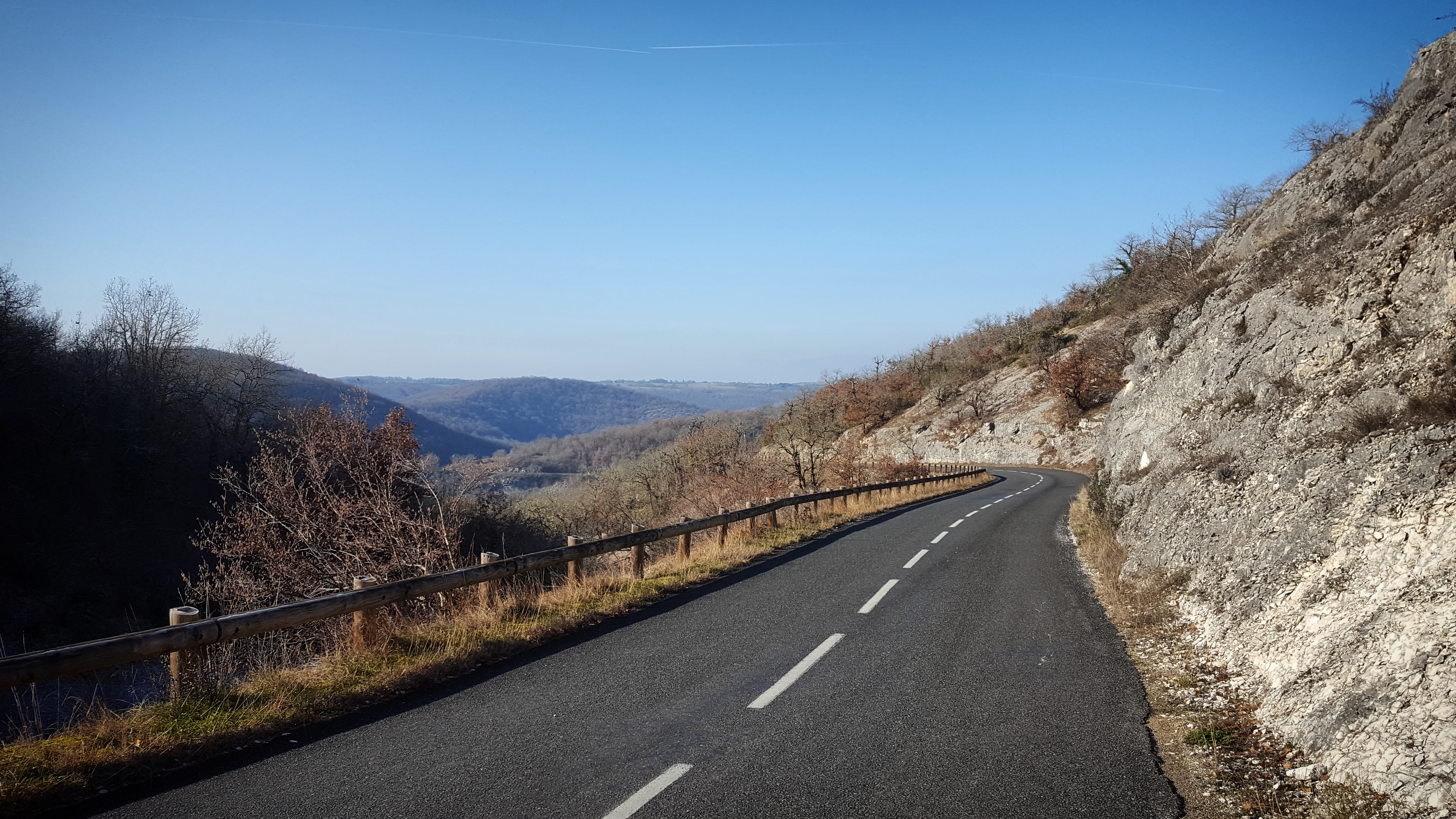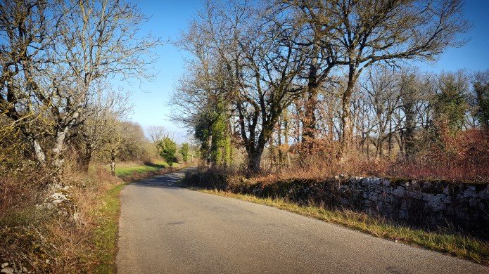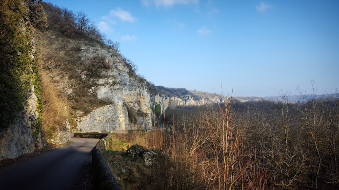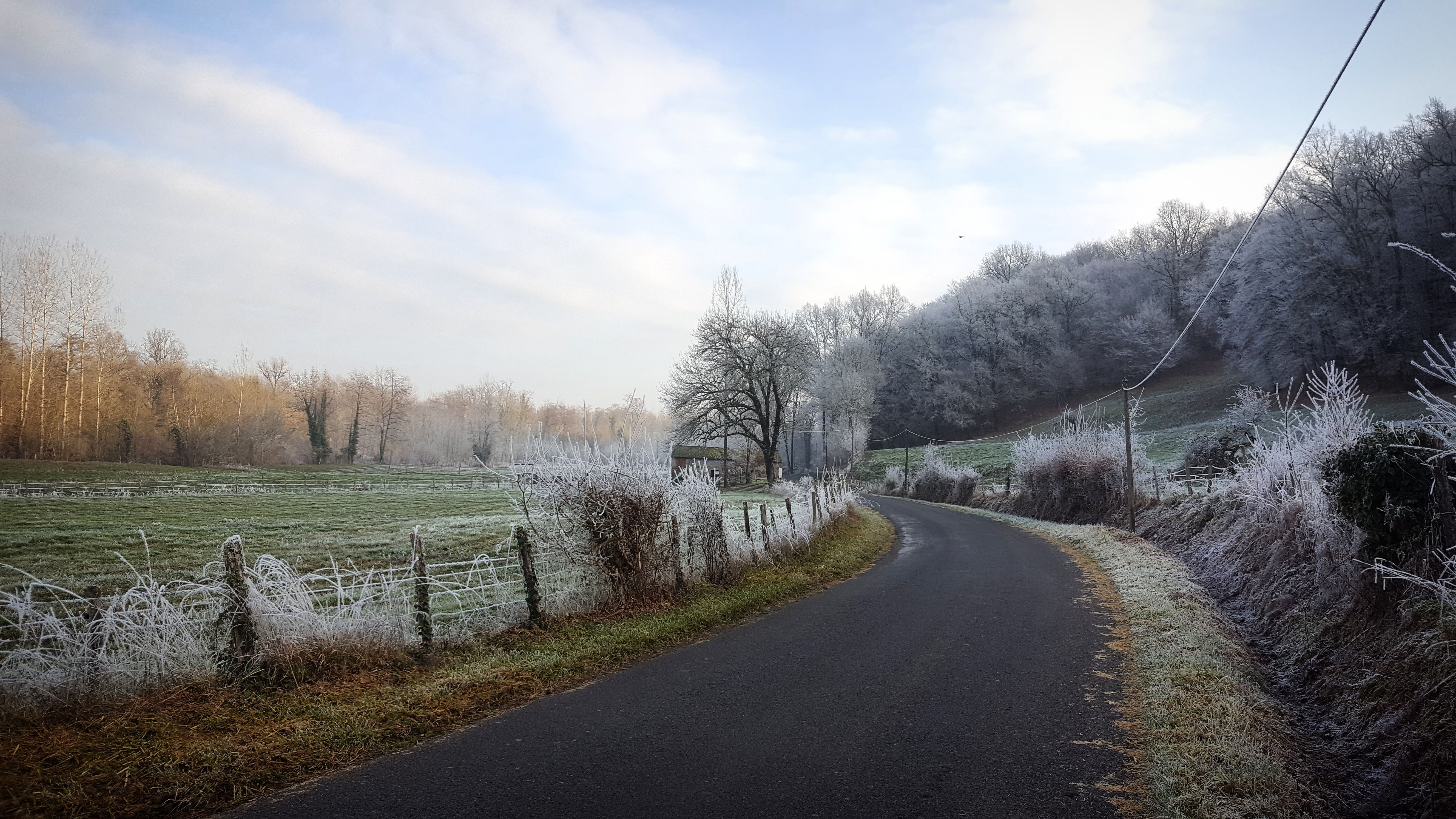 Damn, my ears are cold. Freezing fog in the valley, ice forms on the brake levers. Skittery tyres in the corners… pssht, let a little bit of air out. Wheels feel more settled. The cold damp air mutes the clangs of sheep’s bells beyond an elderly stone wall. The fog thins gradually up the hillside, a white disc appears veiled by layers of cloud. Blue sky by the time I reach the village on the edge of the causse. Winter bright. Climb some more, effort and sunlight warms me. Roads undulate atop the limestone plateau. Gnarled trees, moss covered limestone walls. Roads sparkle, hope there’s no black ice hiding beneath, slot into the car tyre tracks. Shadows stretch along slopes. A buzzard every kilometre, crossing unseen territories. A view over the sacred city built under and into the tall cliffs. Down and around and up and down and around gorges carved through the limestone by rivers. Squiggles and giggles. Across the biggest of the rivers, the Dordogne. Trace it’s edge, hugging the cliffs that cascade to its side. A suspension bridge back across the river by the village with the church carved into the rock face. The shadows the other side of the river are still frozen, a world sprinkled with icing sugar. Frosted trees glisten where the sun doesn’t reach this time of year. Half iced branches stretch golden tips into the sun light. It’s pretty but so cold. Turn back across the river at the next bridge, wave to the cycle club in matching kit, on to the flood plain under the weakening sun, it’s warmth fading. Flat straight roads through fields and dog barks. Back home past the sleepers and the jam factory.
