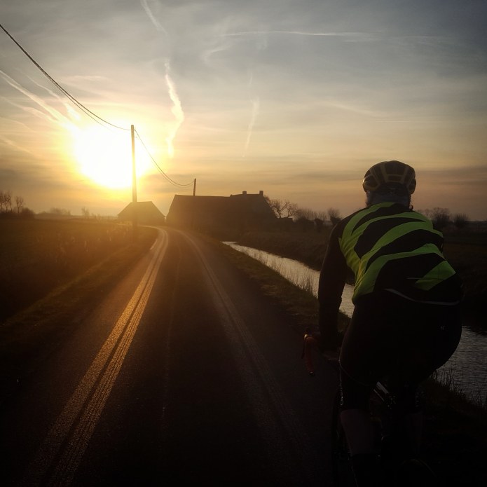 Out of town we bash into a headwind. A headwind we know will stay with us for the first 100km of the ride. It’s not brutal but stiff enough for the effort to be felt. A few kilometres on quiet Sunday morning main roads before turning onto narrow lanes across arable land. Rows of trees and canals accompany us here and there. Sunrise is glorious, the temperature slowly rising. Roads twist and turn between large fields. The horizon is low and flat in every direction. Church spires silhouette against the pale dawn sky. Cyclists coming the other way seem to be going remarkably fast for what appears to be little effort. We start to think of the tailwind we’ll have back to the coast this afternoon.