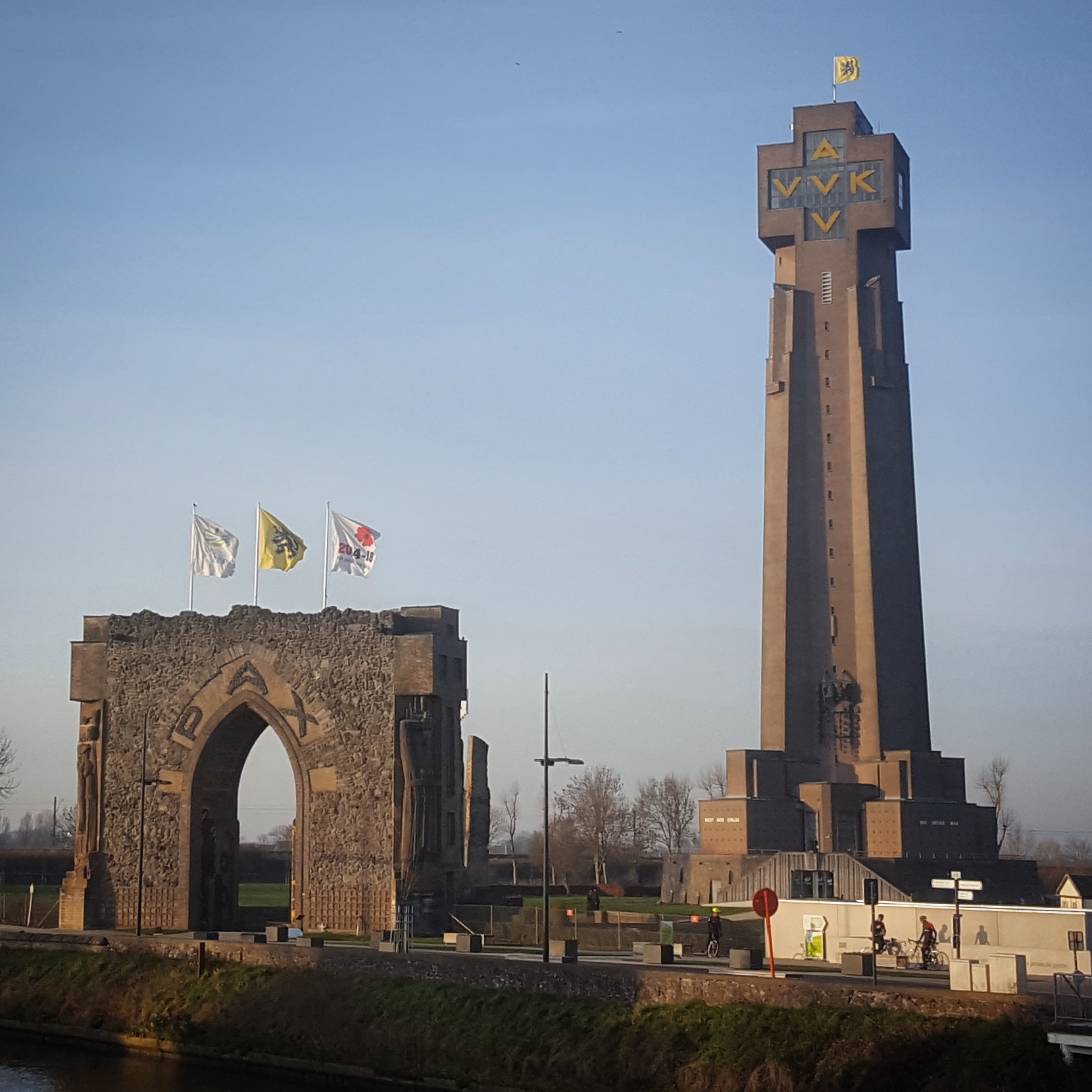 Near Diksmuide we pass the Trench of Death, a remnant of the First World War trench system. A tall tower can be seen not so far away in the town, the Yser Tower, a peace monument. They are the first signs of a dark and horrifying part of the history of Flanders. We’re riding right through the Western Front, the day is likely to be filled with reminders of the human expense of war.